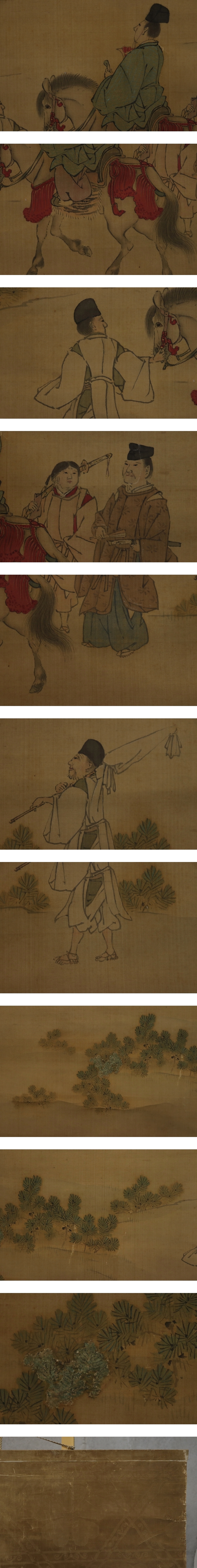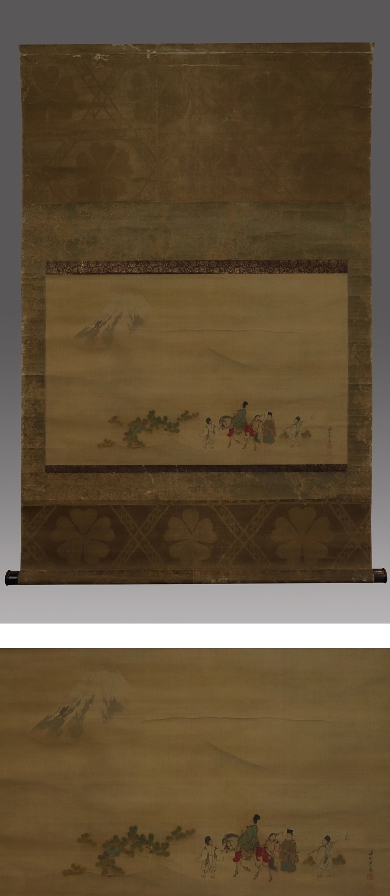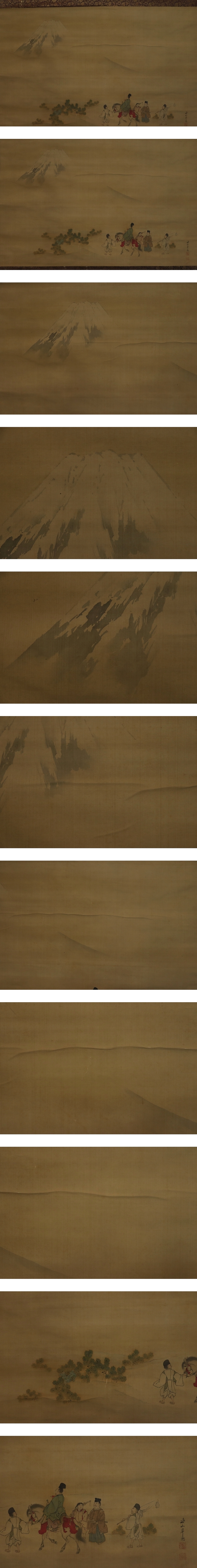 岸連山 きし-れんざん(1804-1859) 江戸時代後期の画家。 文化元年生まれ。京都の人。 岸駒に師事し,養子となって岸派を継ぐ。文政6年有栖川宮家に仕える。 初期の装飾的な画風から、晩年は四条派の温和なものに変わった。 門下に岸竹堂、巨勢小石がいる。 安政6年死去。56歳。本姓は青木。名は昌徳。字は士道、士進。 本紙は、染み、汚れ、折れ、皺、浮き、ヤケ、擦れがあります。 表装は、染み、汚れ、折れ、皺、擦れ、虫食い、破れ、ほつれ、剥れ、 軸先に小傷、箱に傷み、割れがあります。 【サイズ】 作品 横約84.5cm×縦約54cm 表装 横約98cm×縦約151cm |