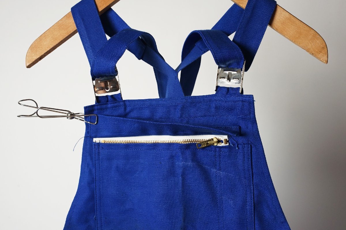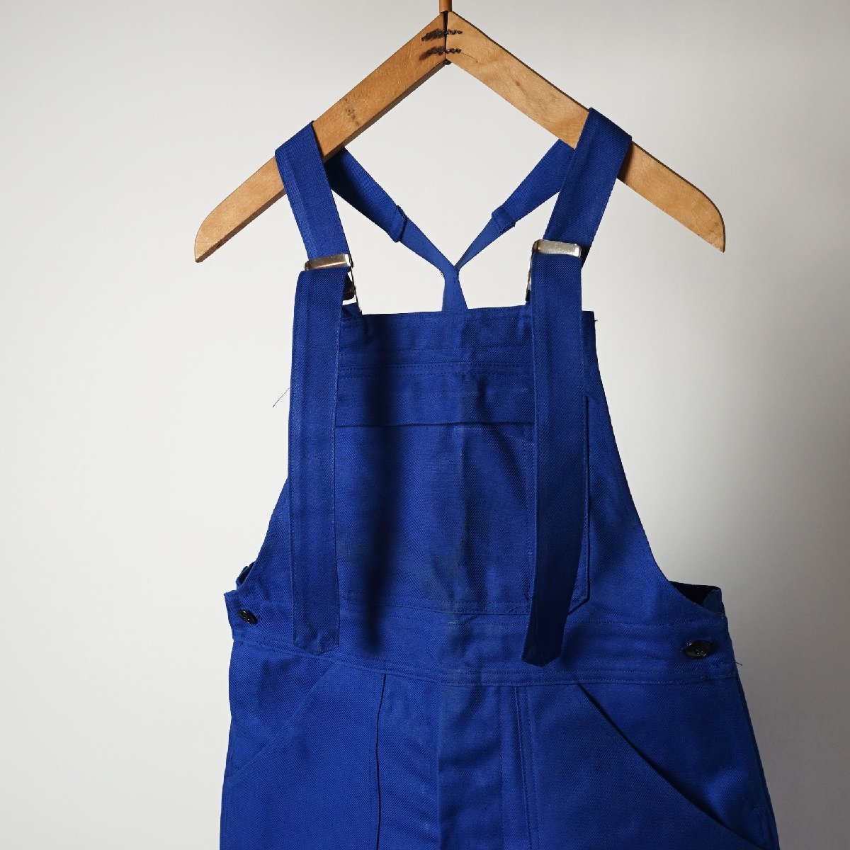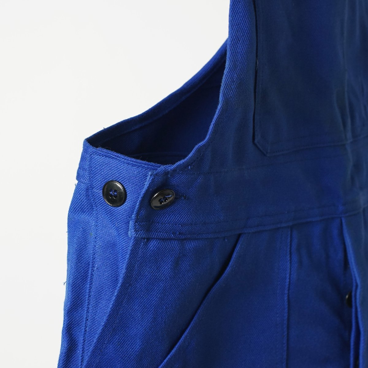 ○素材:フランス ヴィンテージオーバーオールです。 素材はコットンツイルです。肩のストラップは一部がゴムで背面ボタン留め仕様のセパレートタイプです。ビブは大きめのジップポケット、前ウエスト下付近両側・右ヒップにポケットが有ります。フロントに開閉可能なボタンがついています。フランス購入品です。