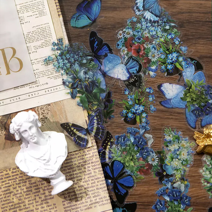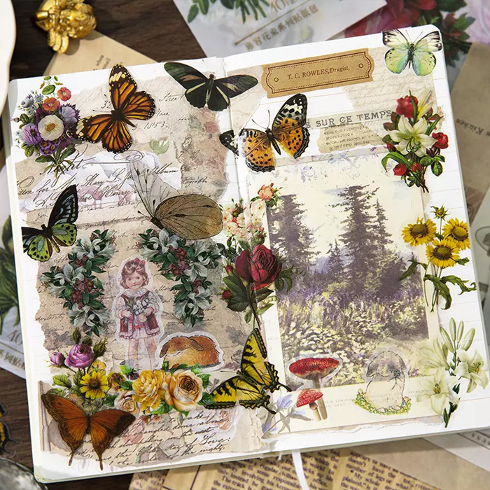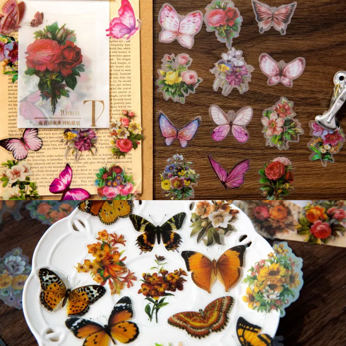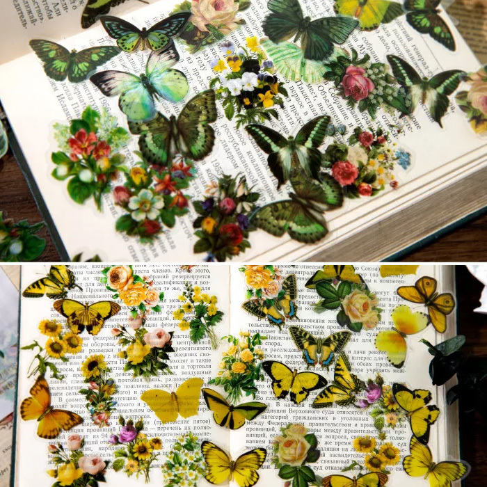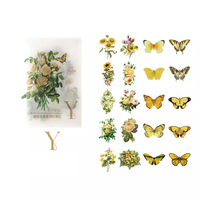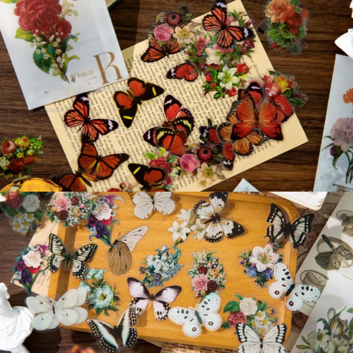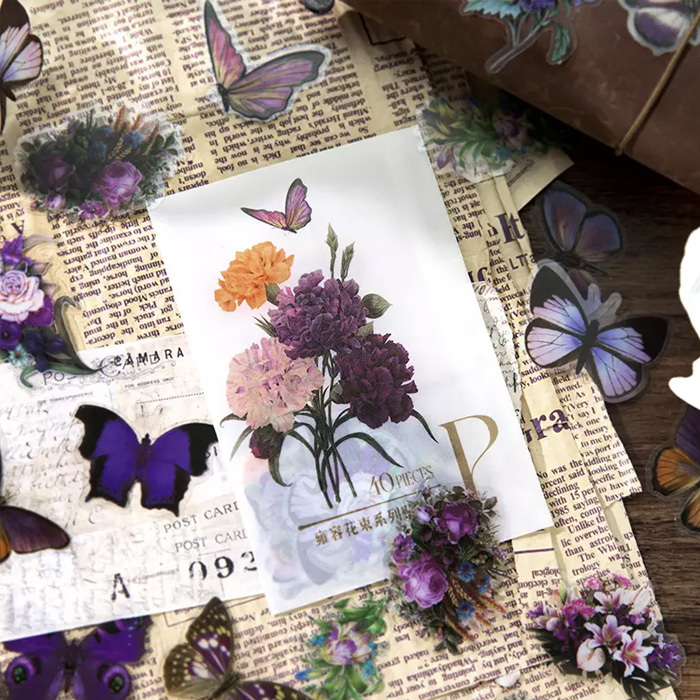 40枚 シール 花 透明 蝶 防水 おしゃれ アンティーク ビンテージ デコステッカー アンティーク調 コラージュ レトロ 1078-5