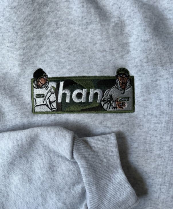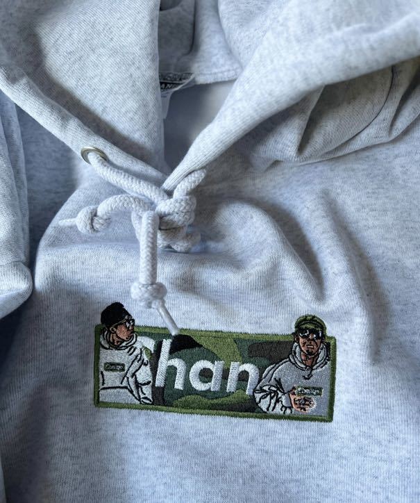 グレーボディにボディにカモフラ柄のBOXロゴ、、、さらに歴史を感じる人物の時間経過を感じることができるイラストはかつてのあのムーブメントを体感した人間にとっては堪りませんよね。ここまで洒落が効いていてさらにクオリティが高いモノはCHANGEでしか出せないと自信をもって言えますよ!自然な肩落ちや大きめのアームホールなどシルエットもイイです。袖のたまりや身頃のボリューム感など。。。15.0オンスという類を見ない厚さで念願のフードの立体感も大満足だと思います。表糸はオープンエンド糸なので独特のシャリ感や経年変化を楽しめます。