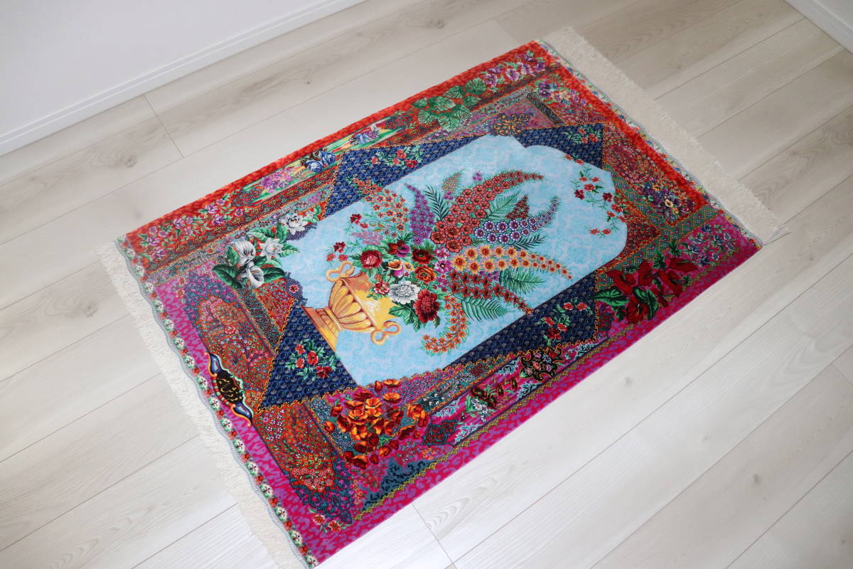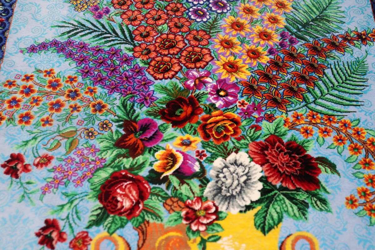 本作品は、美しいスカイブルーと稀に見る配色が特徴のペルシャ絨毯です。