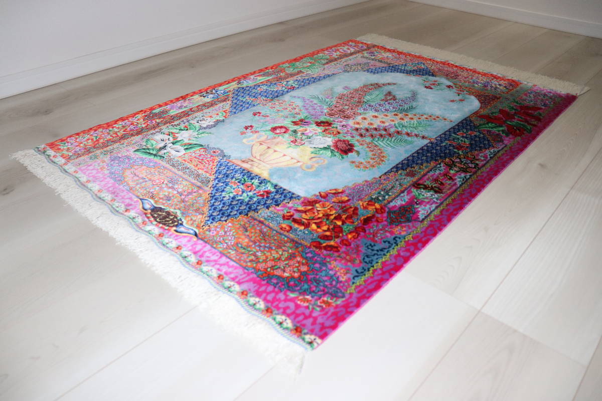 誰もが魅了される最高品質のシルク、クム産の美しい芸術的なペルシャ絨毯のご紹介です。 素材はシルク100%ですので、薄く、手触りは柔らかく、そのしなやかで繊細な品質は、他を圧倒するほどの出来映えです。 驚くような細かな織り目とビロードのような生地、肌に吸い付くようなシルクの艶やかな光沢感が豪華絢爛。