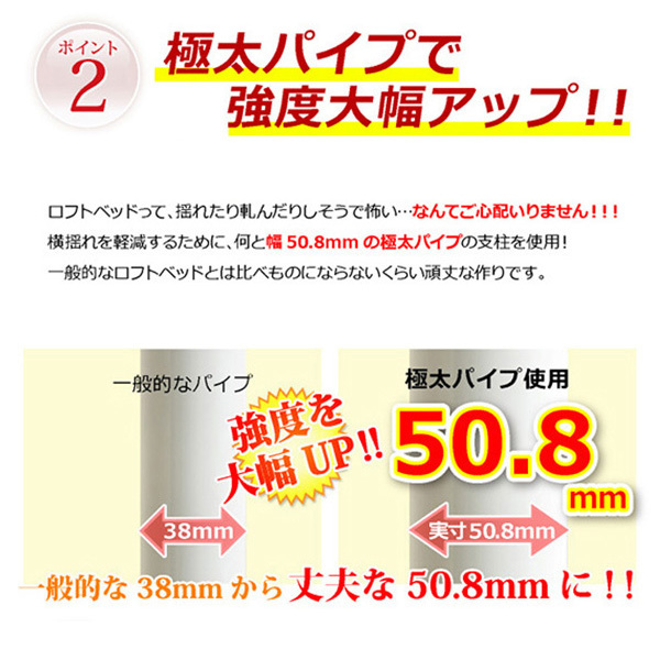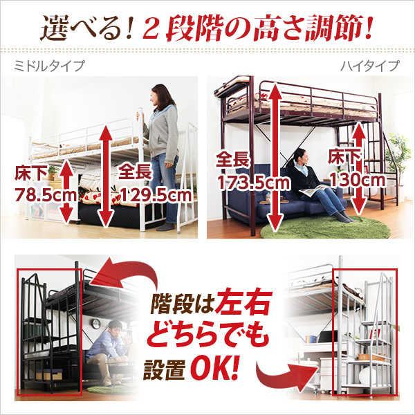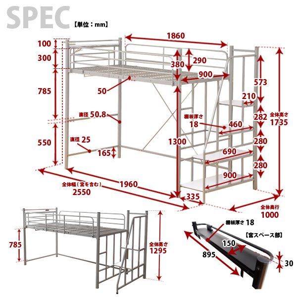 | 商品説明 | 商品名:階段付き ロフトベット レジデンス 出品商品はシルバー色です。 商品サイズ ハイタイプ:(約)幅255cmx奥行き100cmx高さ173.5cm ミドルタイプ:幅255cmx奥行き100cmx高さ129.5cm 商品重量:83.0kg 梱包サイズ 3個口 (1/3)(約)134x109x14.5cm (2/3)(約)107.5x107.5x14.5cm (3/3)(約)194x42x9cm 梱包重量:85.0kg 素材:スチールパイプ 耐荷重120kg お客様組立商品 画像に写っている小物/マットレス/付属品等は商品に付属致しません。 商品画像は、デジタルカメラで撮影しておりますので、 お客様のPCモニターやインターネット環境の違いにより、 多少色合いが違って見えることが御座います。 予めご了承下さい。 |