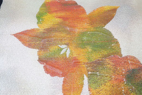 オフホワイト地に、椿が織り込まれた名古屋帯です。 全体的に虹色のぼかしが施されたお品です。 未使用品です。 |