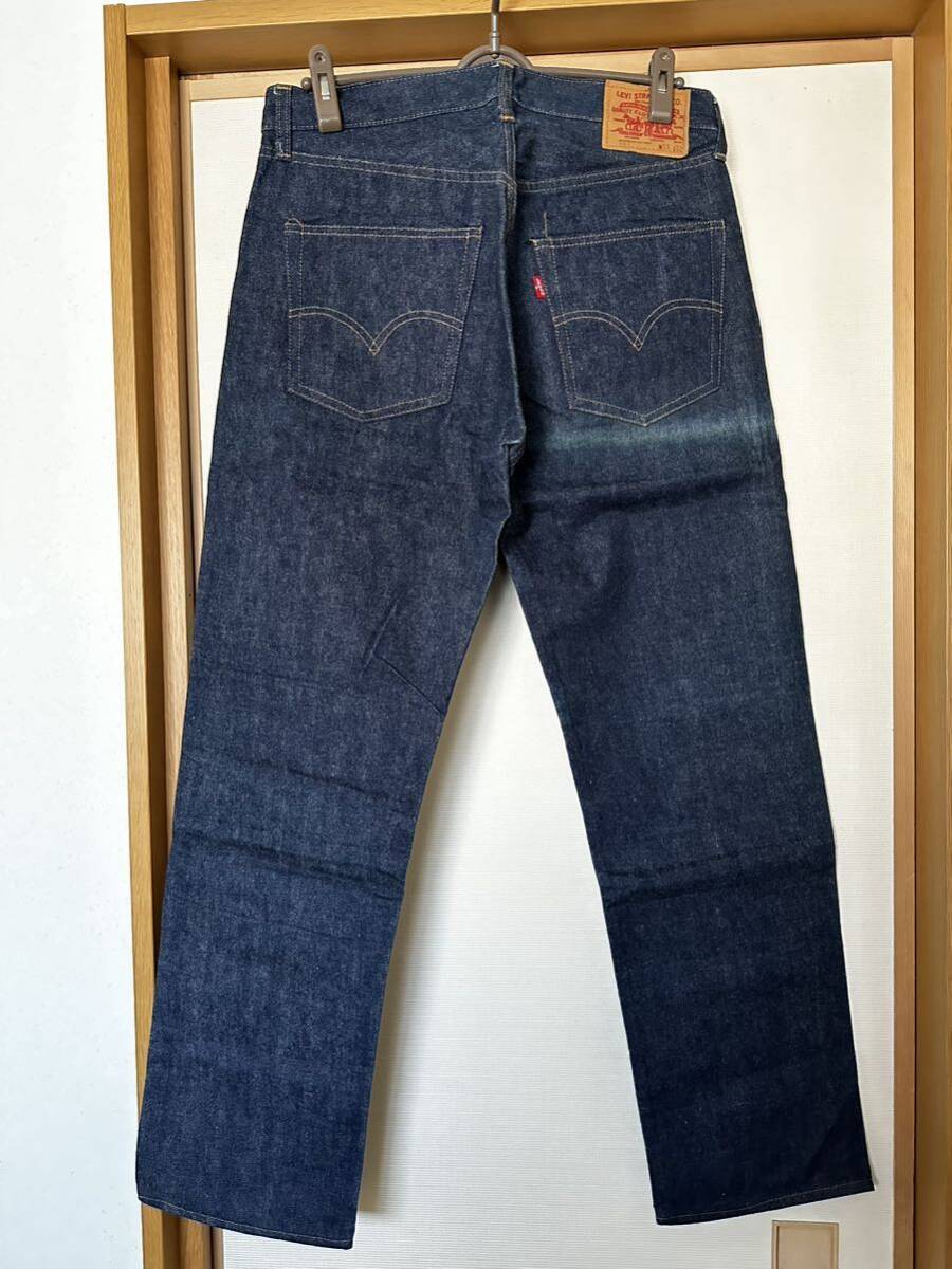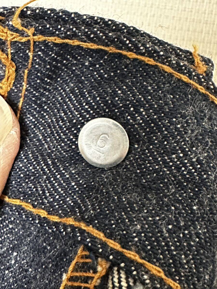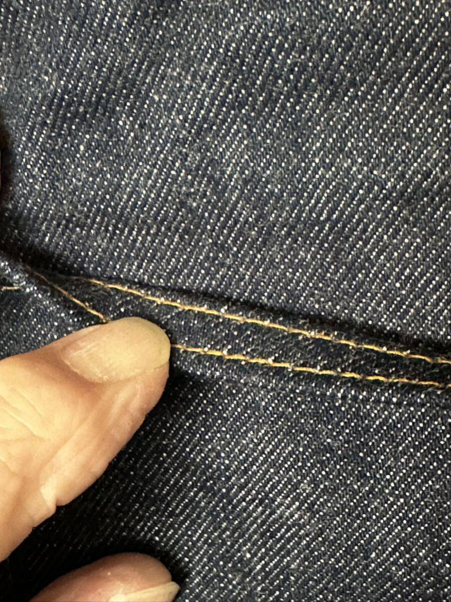 随分前に購入し押入れで眠っていました。入手時からフラッシャーはありませんでした。写真の通り、右ポケット下に焼け跡があります。この焼けのおかげで売れ残っていた商品のようでした。リジッドでのサイズは平置きでウエスト42センチ、裾幅21.5センチ、股下(インシーム沿い)75センチです。
