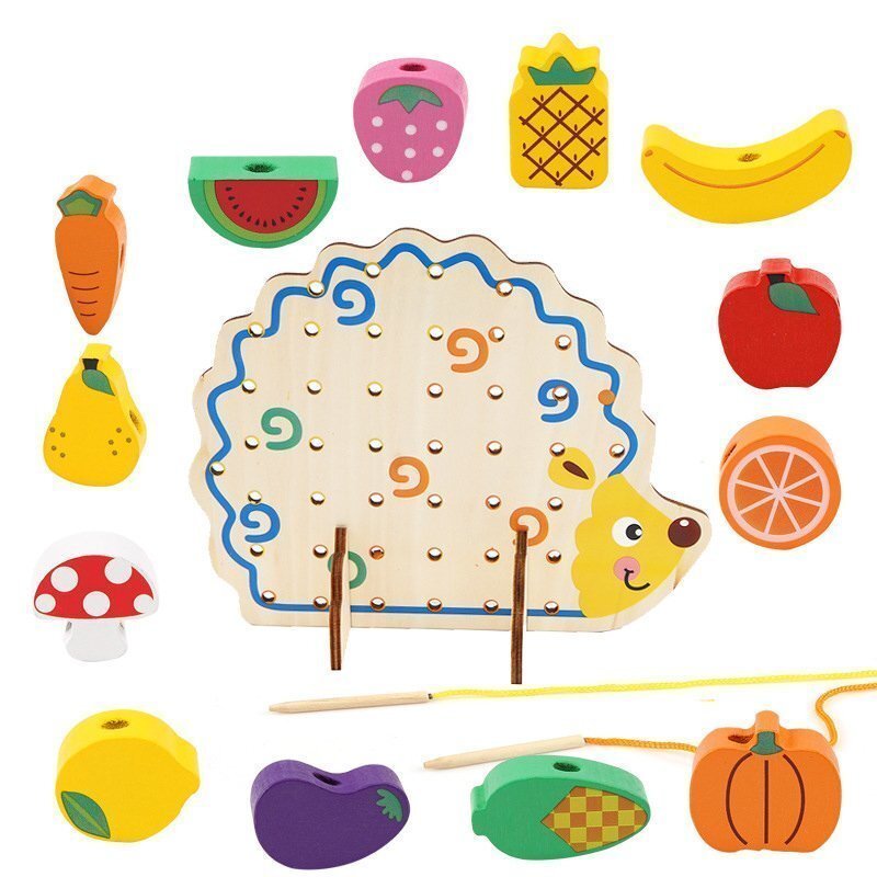 ●【興味】可愛いハリネズミにフルーツや野菜を1個1個紐通す。紐通し順番によって毎回のデザインがことなります。全体の美感と合理性を考えながら飽きなく長く遊び続けられます。