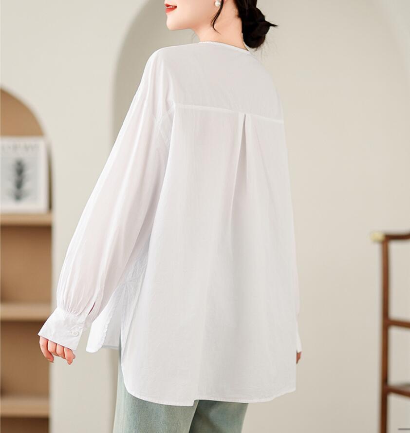 新入荷~カジュアル 可愛い 綿麻混 トップス ナチュラル ゆったり コットン チュニック 長袖 素敵な 大きいサイズ シャツ~ホワイト~M