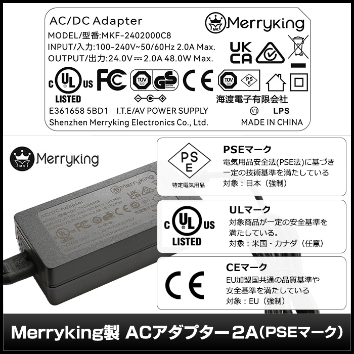 | ◇外形寸法 サイズ:約100.0×46.2×32.0mm(奥行/幅/高さ) ケーブル長(出力):約1.5m メガネケーブル長(入力):約1.8m DCジャック外径:5.5mmφ DCジャック内径:2.1mmφ ◇仕様 分類:スイッチングACアダプター 型番:MKF-2402000C8 出力電圧:24V 出力電流:2A 消費電力:48W メーカー:Merryking (メリーキング) 入力端子:差込プラグ 出力端子:DCジャック ジャックタイプ:ストレート 定格入力電圧:100~240VAC 入力周波数:50/60Hz 極性:センタープラス DCコード規格:AWG20/300V/80℃ 重量(本体):約200g パイロットランプ:青色LED 保証:商品到着後、1年間の品質保証が付いております。 万が一品質に問題があった場合は、メールにてご連絡ください。 | |