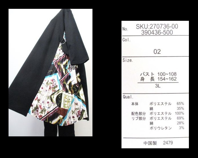 | 商品紹介 | ★表示サイズ…3L(バスト100-108 身長154-162) ★素材 本体…ポリエステル65% 綿35% 配色部分…ポリエステル100% リブ部分…ポリエステル69% 綿28% ポリウレタン3% ★中国製 ★お色…黒 ・左サイドプリントプリーツ入り ・重量…360g ★実寸(多少の誤差はご了承ください) 肩幅:47㎝ 身幅:58.5㎝ 袖丈:50.5㎝ 着丈:91㎝ ●土日祝日年末年始は発送できませんのでご了承ください。 ●画像の色合いは撮影環境、モニター環境により実物と若干異なる場合がございます。予めご了承ください。 まとめて取引は最初の落札から72時間が対象です。 最初の落札商品の取引ナビで同梱希望の旨をお知らせください |
