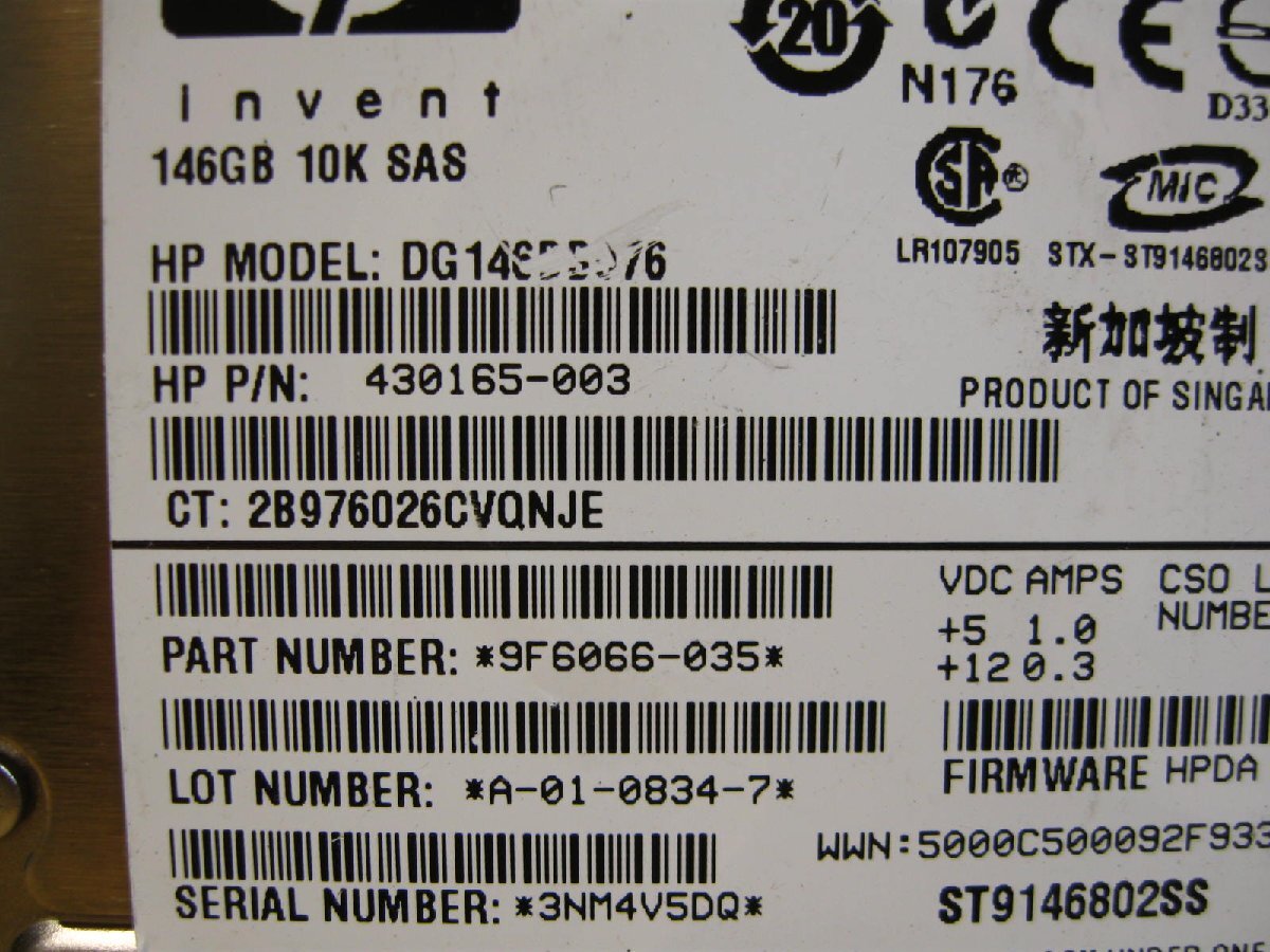 | HP DG146BB976 146GB SAS接続 10000rpm 内蔵SCSI HDD です。 HP MODEL: DG146BB976 (ST9146802SS) HP P/N:430165-003 GPN:375863-010 ローレベルフォーマット済みです。 スキャンディスク検査にて不良セクタが無いことを確認しております。 (※ローレベルフォーマットはHDD LLF TOOL、スキャンディスクはHDD SCAN V2.0を使用) (※ご利用の機種でフォーマットしてからお使いください。) 付属品はありません、本体のみとなります。 写真は同機種の写真を流用しているため外観の状態、ラベルのフォント、リビジョン、datecode等が若干異なる場合がございます。 特定のリビジョンやファームウェア等ご希望の方はあらかじめ質問にて確認をお願いいたします。 使用時間等は不明です。 中古品につき、若干の汚れ/傷等が御座います。 外観を気になされる方は購入を御遠慮下さい。 | ||||||||||||||||||||||
