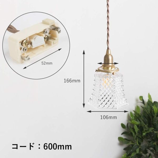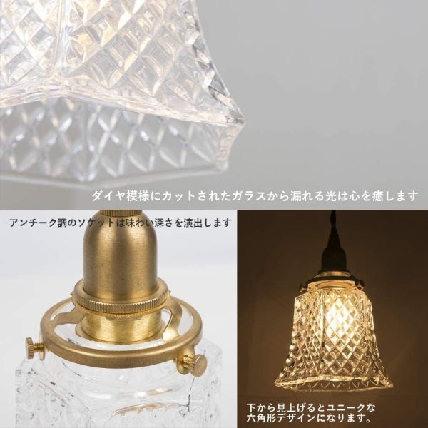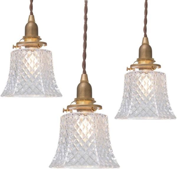 • ガラスのペンダントライト:ダイヤ模様が輝くガラスのペンダントライト。ガラスの凹凸より動きのある綺麗な光が生まれ、消灯時でも目立つ存在です。