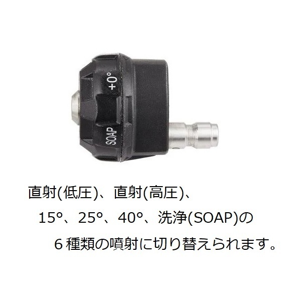 ・直射(低圧)、直射(高圧)、15°、25°、40°、洗浄(SOAP)の6種類です。