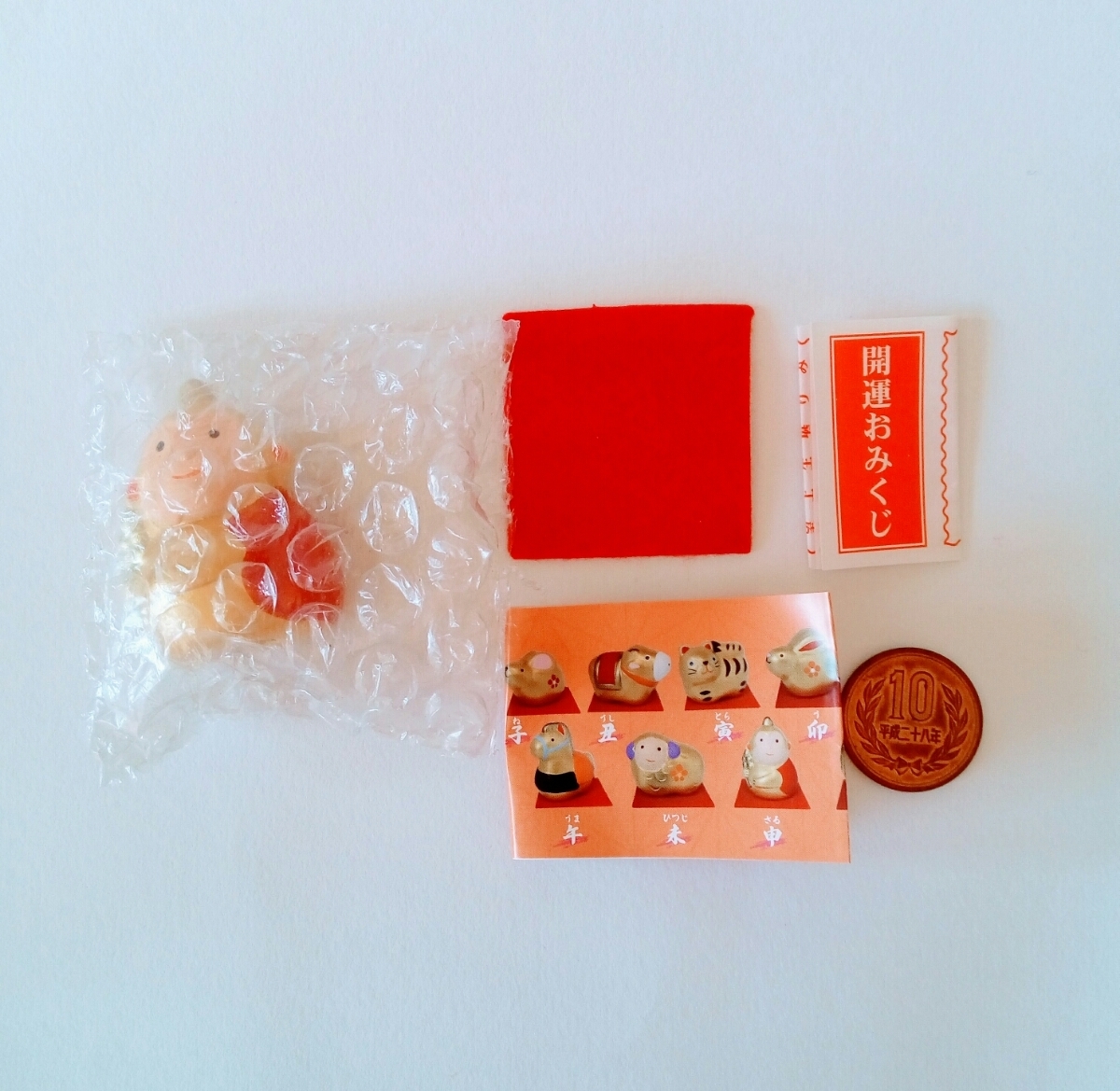 リーフレット、赤いフェルトの敷物、開運おみくじが付属します