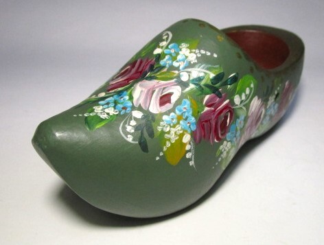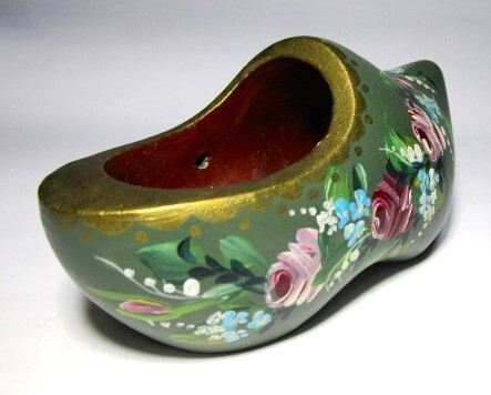 ◆・オランダ木靴(片方)  金彩縁に花柄がハンドペイントされ丁寧に作られた小ぶりな木靴置物です。