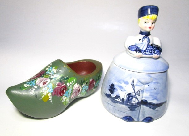オランダ★飾り木靴(片方)+人形小物入セット★デルフト焼 少女 キャンディーポット 小物入 一輪挿し 花瓶 ポプリ入 トールペイント