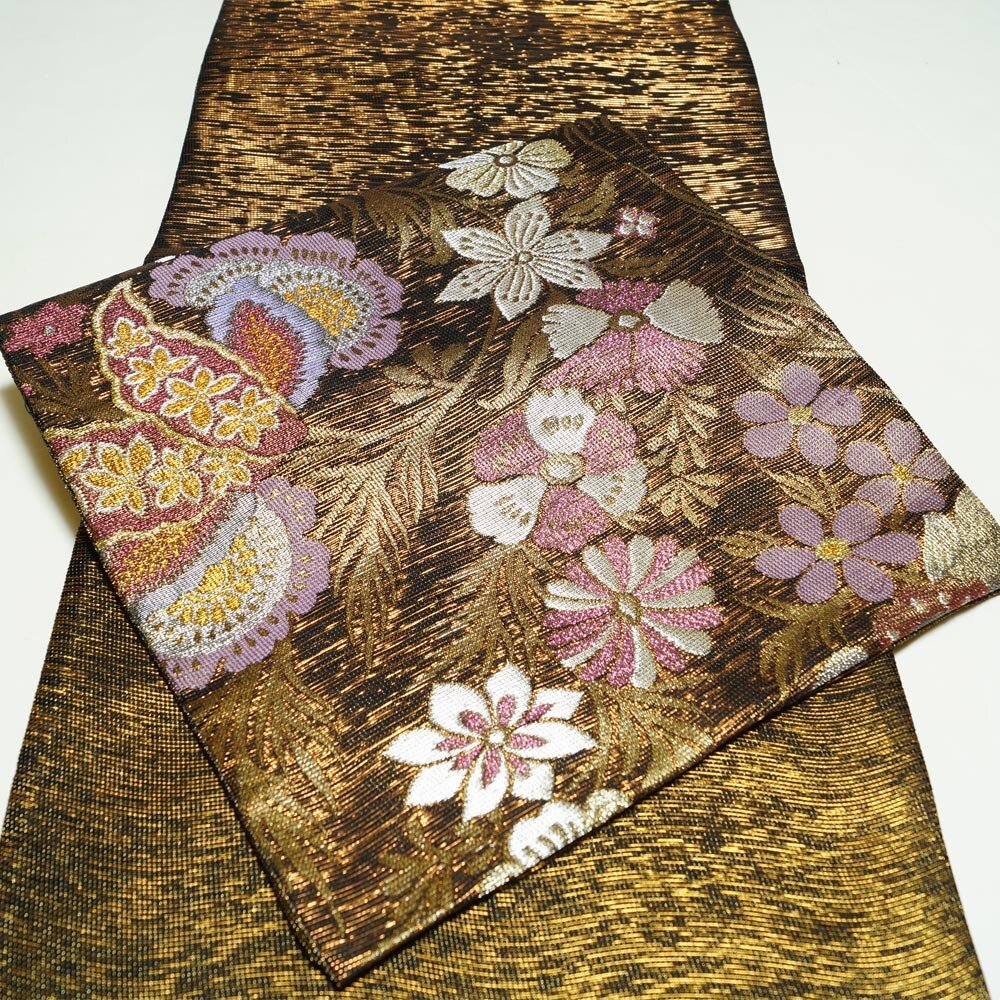 商品 説明 | 銅色の錦を織り込んだ黒色系の御寮織のような地厚な帯地に、唐花や石榴模様が金銀色糸で織られた袋帯です。製造元は不明ですが非常に上質な錦織帯です。 |