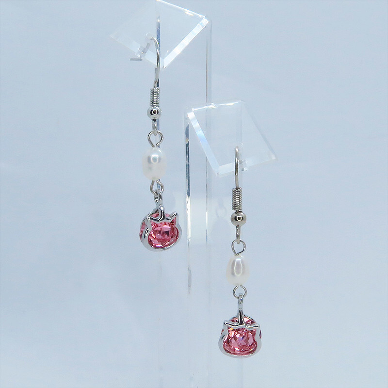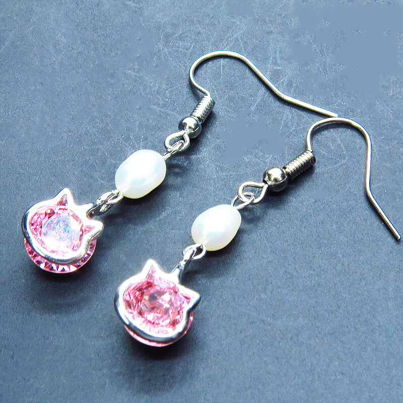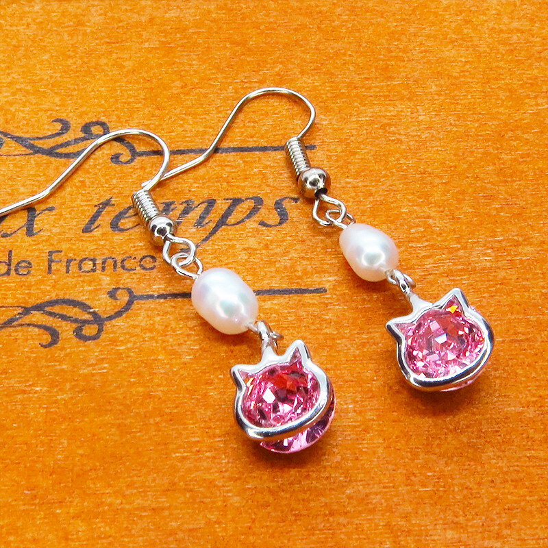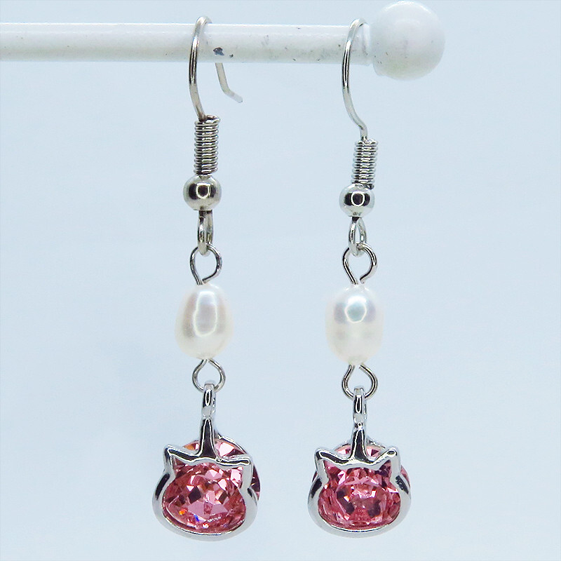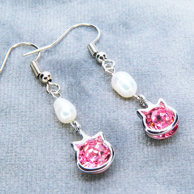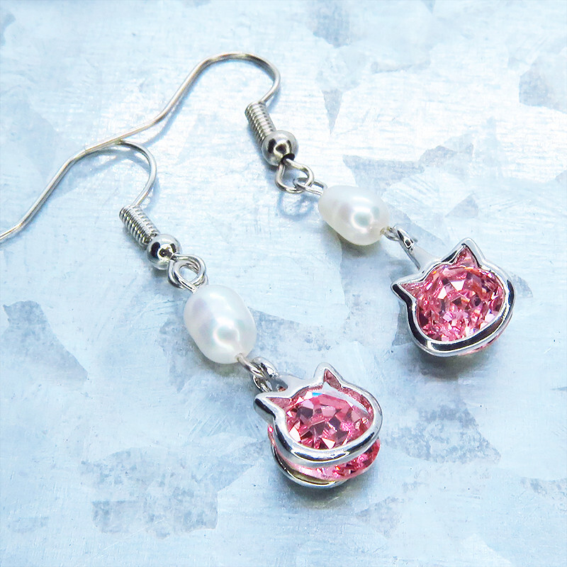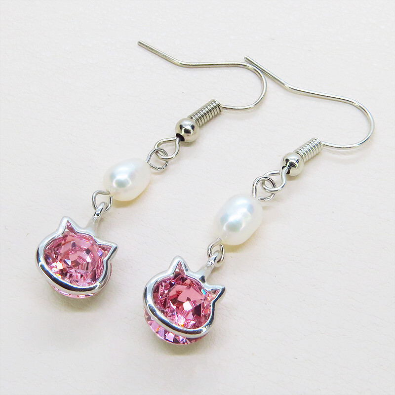 かわいらしい猫のフレームにスワロフスキー・クリスタル(ライトローズ:淡いピンク)をあわせた猫モチーフに淡水パールを加えたフックピアスです