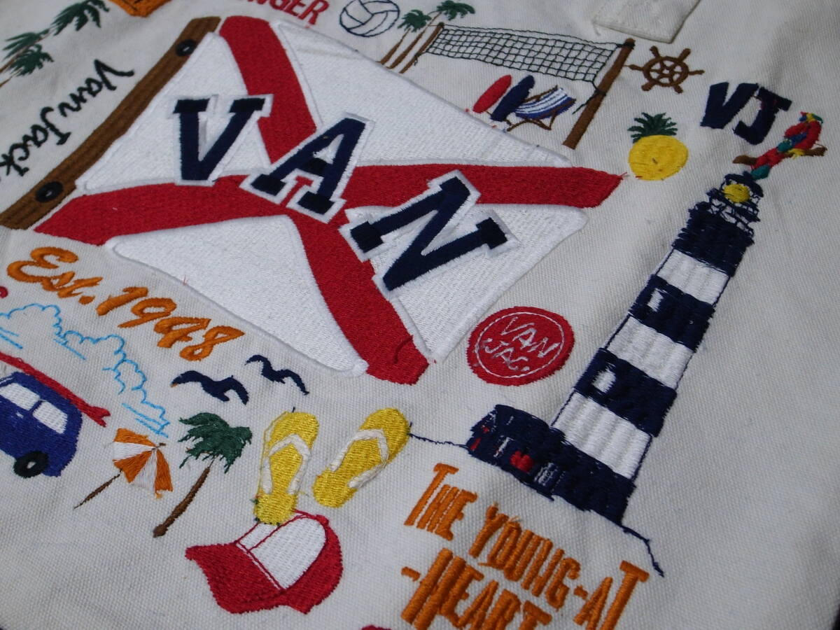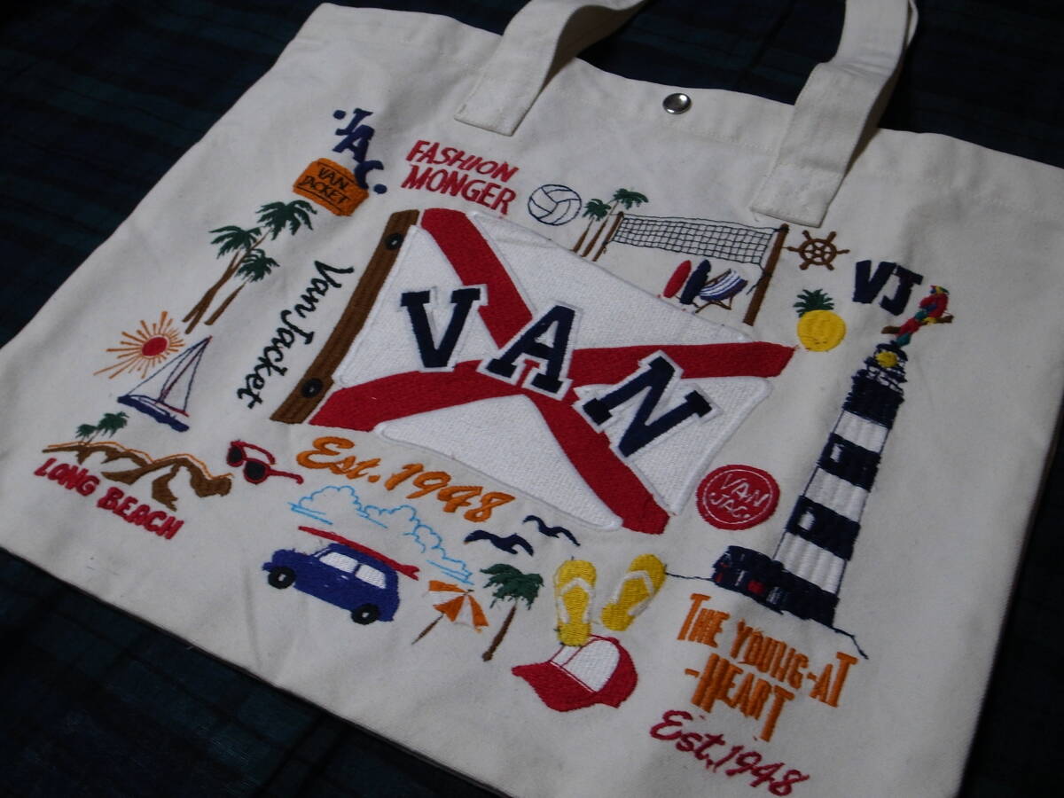 トートバッグのフロントは、VANオリジナル各種絵柄・ロゴが豪華総刺で施されています。