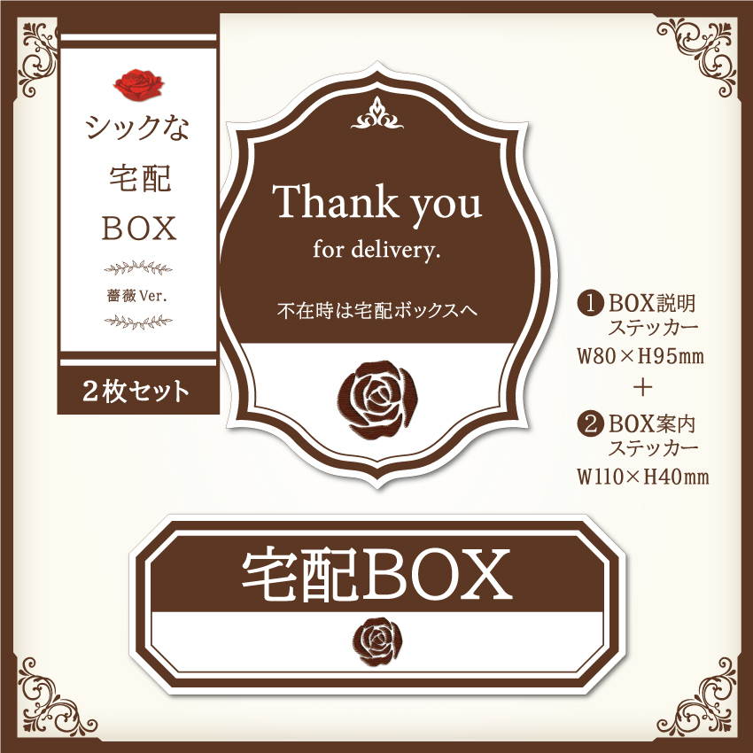 【シックな宅配BOXステッカー・薔薇Ver.~2枚セット~】宅配ボックスステッカー/置き配ステッカー