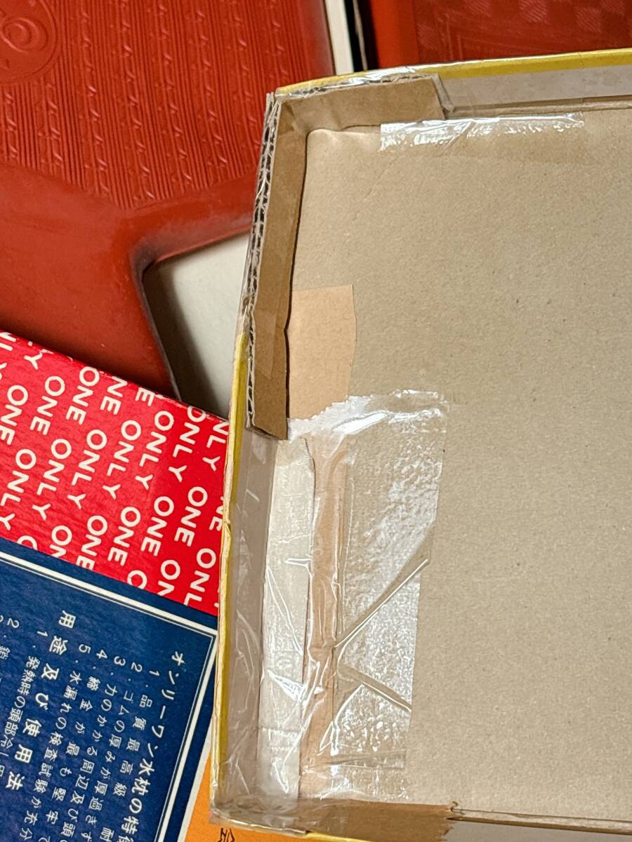 紙箱に痛み破れがありテープにて補強修理を施してあります。