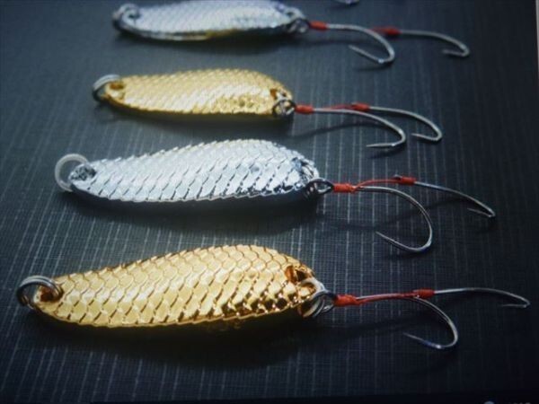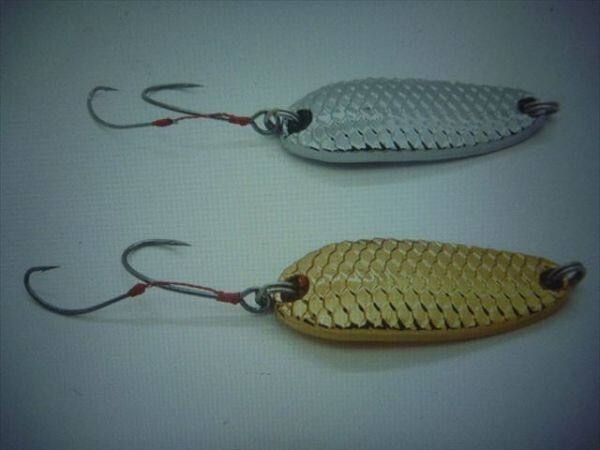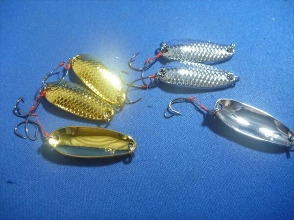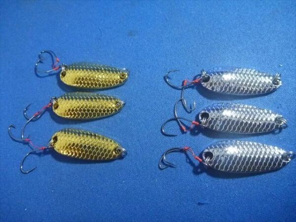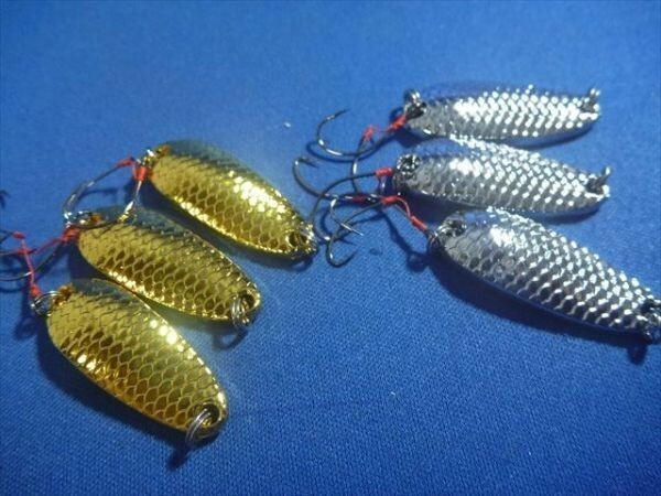 | 商品説明 | 金 3個 銀 3個 6個セットとなります。 ダフルフックタイプでバラシが減ります。 渓流・管理釣り場・エリアトラウト・などあらゆるところでお使いいただけます 大きさ・重さは写真をご覧ください。 |