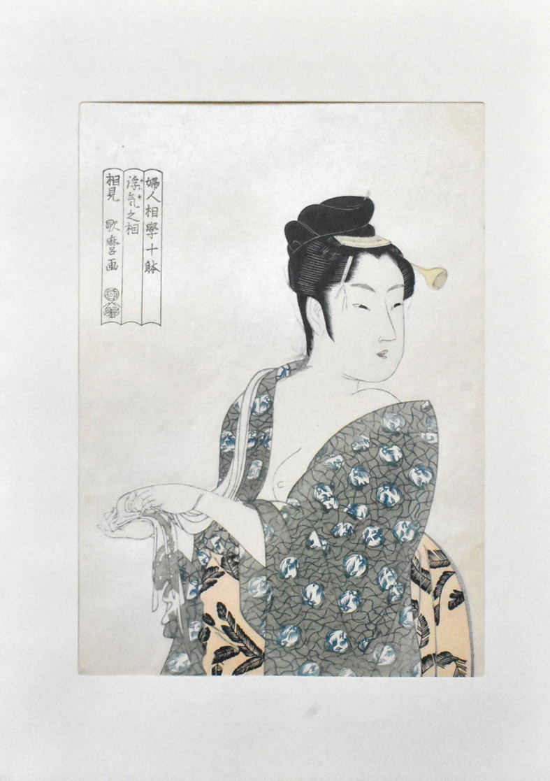 1753?~1806(宝暦3年~-文化3年) 江戸時代に活躍した浮世絵師の代表的な一人。 女性の姿を半身像で描いた「美人大首絵」を発表して、一躍人気絵師になる。 大胆な構図と繊細な描線を特徴とし、女性の顔の表情だけでなく、内面を深く捉えるような豊かな表現で、 女性の理想美を追求した美人画の大家である |