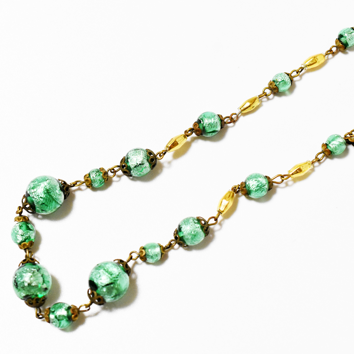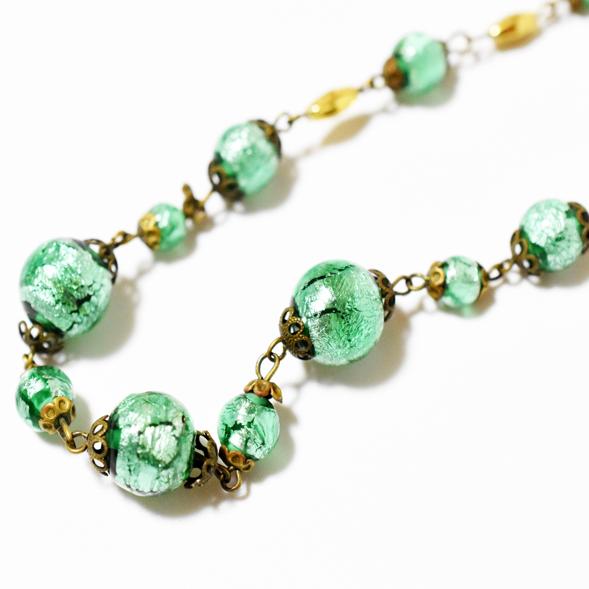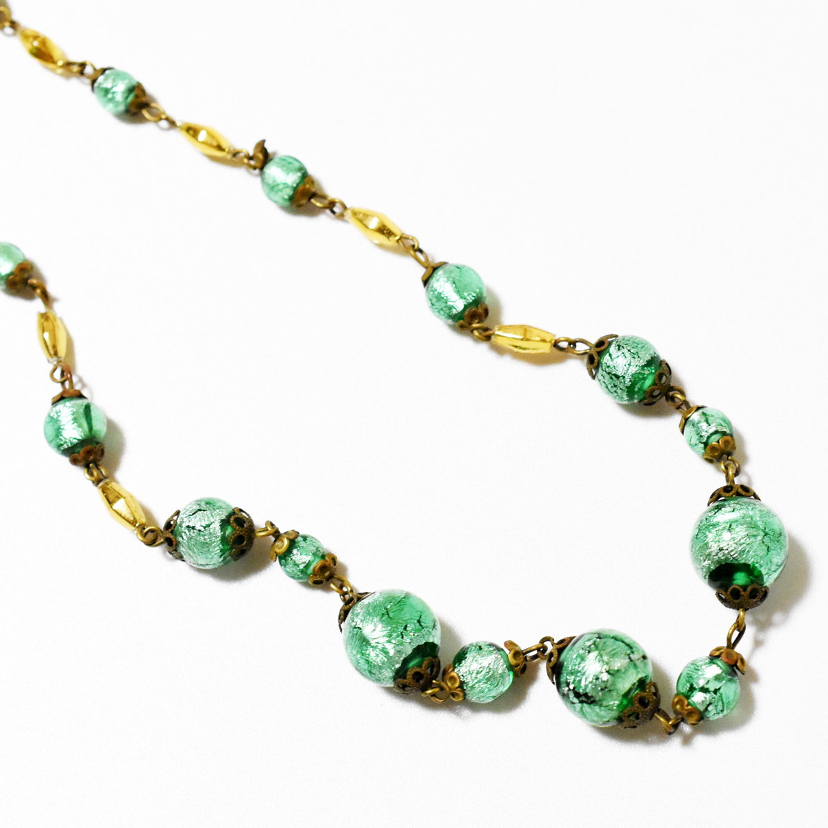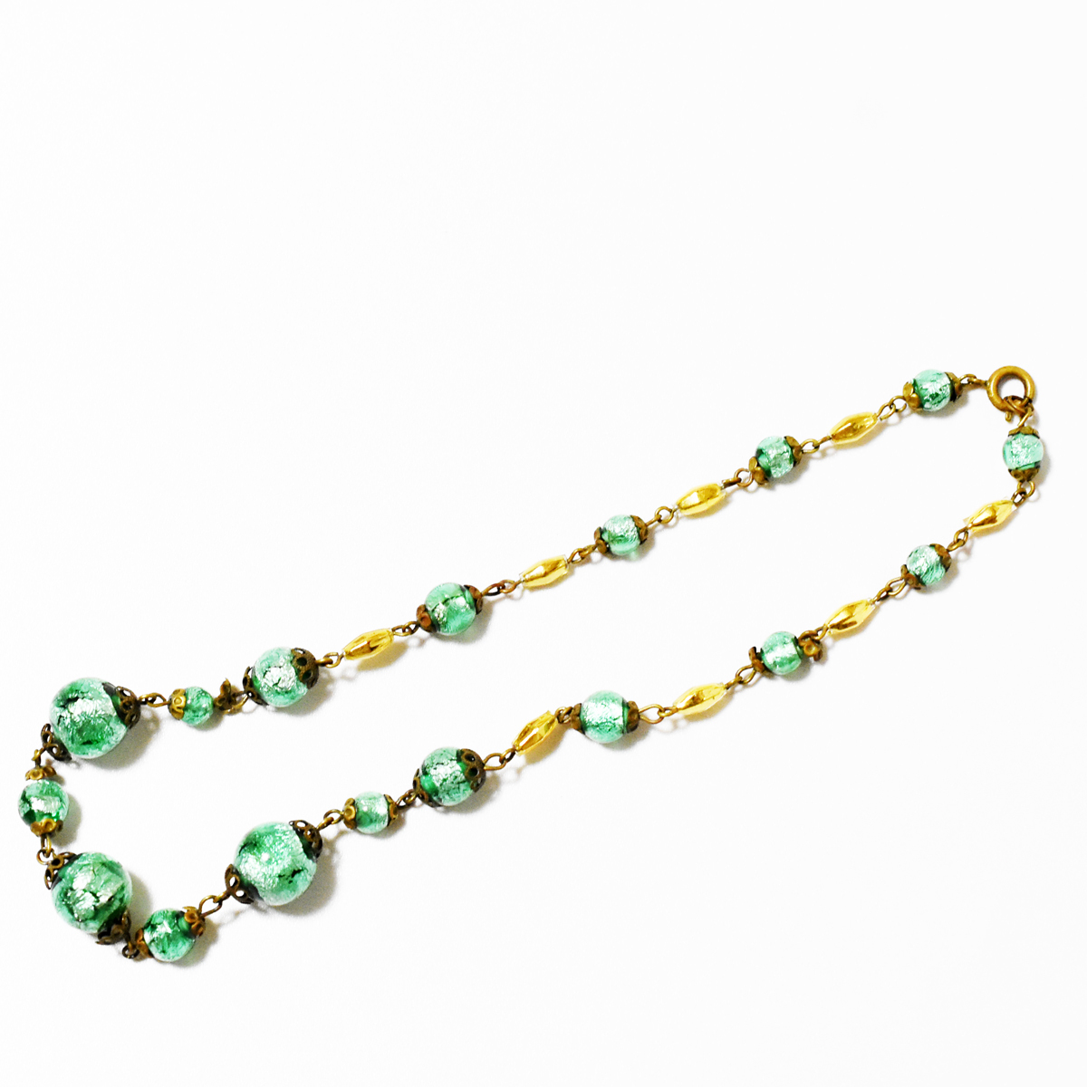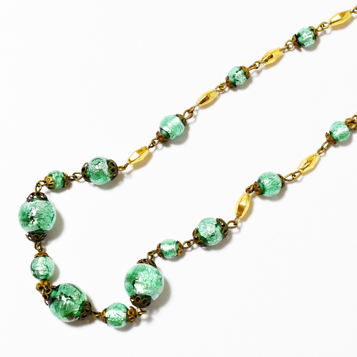 グリーンカラーの輝きが美しいガラスビーズが使用されたヴィンテージネックレス。