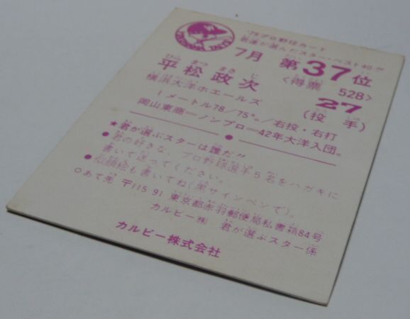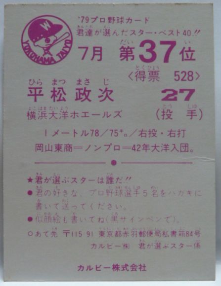 カルビープロ野球カード79年7月第37位#33【平松 政次(横浜大洋ホエールズ)】1979年 昭和54年おまけ食玩トレーディングカード【中古】送料込