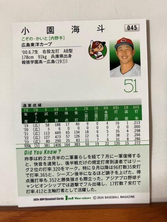 【2024 BBM 1st】045小園海斗(広島東洋カープ)レギュラーカード