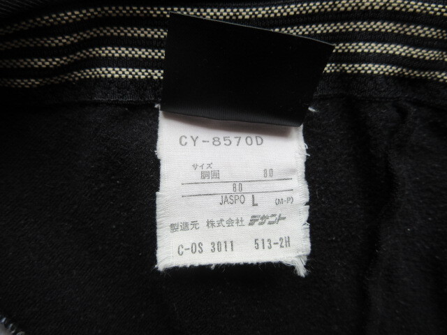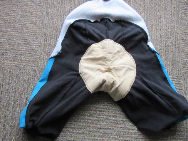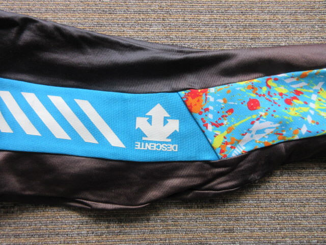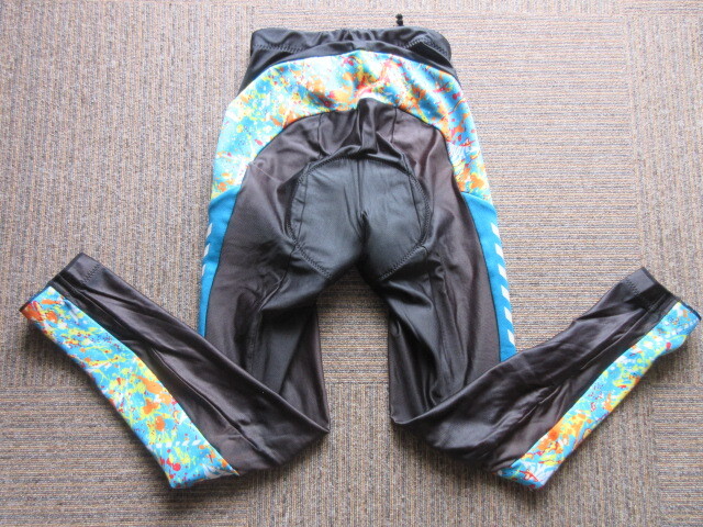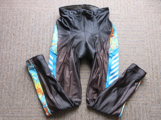 ポリエステル90%、ポリウレタン10%でLサイズ、胴回り80。カラーはブラックとライトブルー。長さ93CM、股下68CM、裾10,5CM。(多少誤差あり)使用感があります。パット付き。