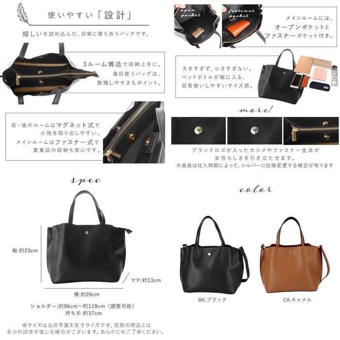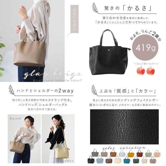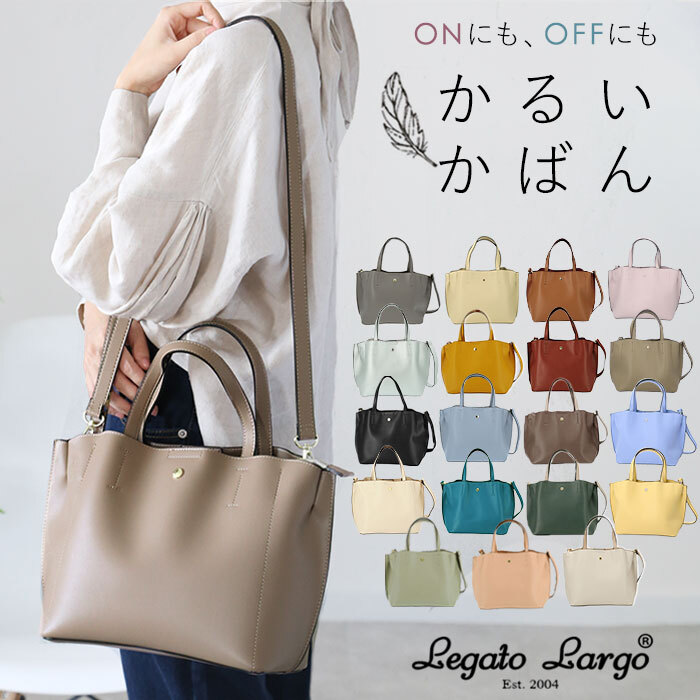 商品説明 | ・・軽量の張り合わせ合皮を素材に使用した、軽くて持ちやすい、軽量化にこだわった「かるいかばん」。フォーマルな場所やオフィスユースに最適!ちょっと大人めの2WAYトート。 ・ほどよいシボ感のあるフェイクレザーと、単一カラーのシンプルなフォルム。メイン収納内側にも外側のカラーと同系色の裏生地を使用した落ち着いた色使いも魅力。 ・Legato Largoのロゴが入ったカシメが大人の女性の雰囲気にマッチするデザイン。 ・メイン収納は3ルーム仕様。前側後ろ側のルームはマグネットボタンでカンタン開閉。スマートフォンやパスケースなどサッと取り出したいものを入れておくのに便利。 ・中央の収納ルームはファスナー式で、長財布や手帳、コスメポーチ等をしっかり収納できる。小ぶりなサイズながら、マチがしっかりあるので、お弁当箱や500mlペットボトルも縦置きでジャスト収納♪ ・手荷物が増えた時や、片手に傘を持ちたい雨の日などは、ショルダーベルトで肩掛けにしてお出掛けできる♪ |