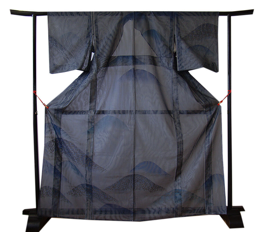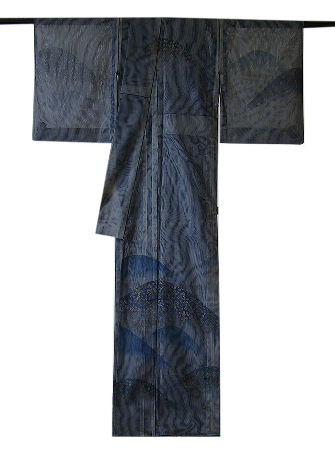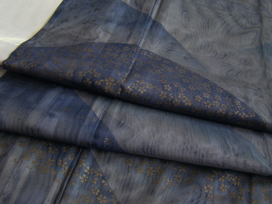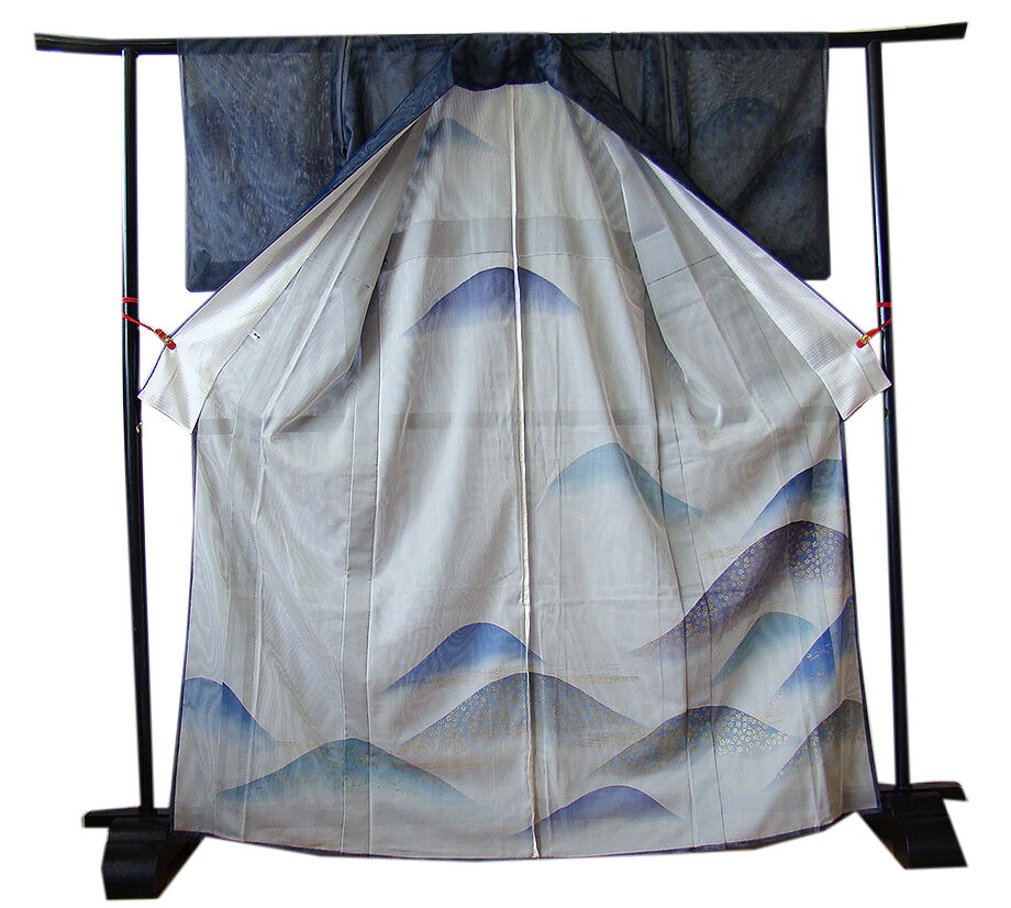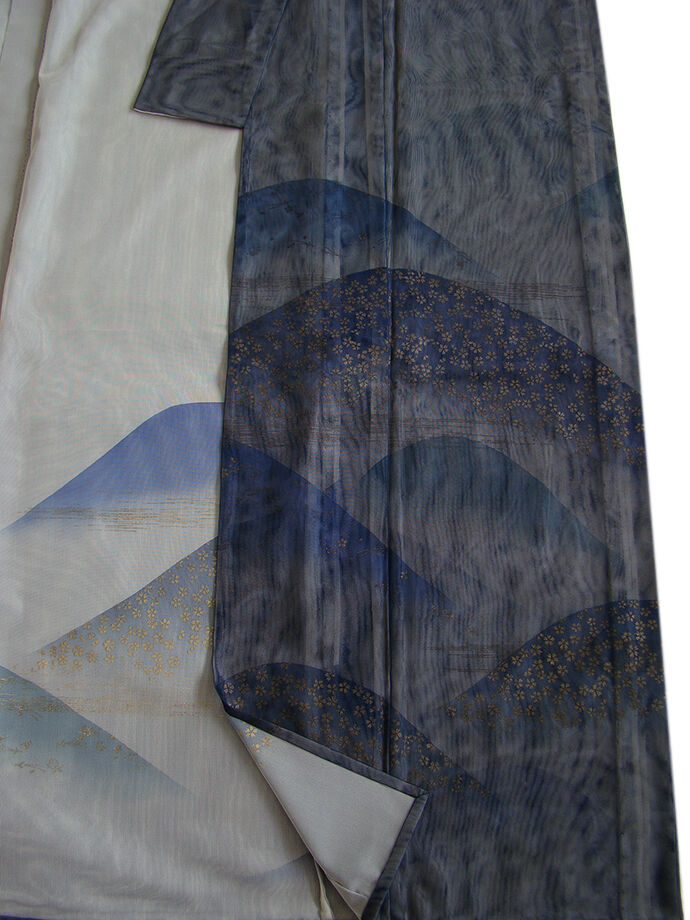 | 商品説明 | こちらのお品は「二重紗」ですので、5月、6月、7月、9月にお召頂ければと思います。 とてもしなやかなさらっとした手触りの涼やかで柔らかな風合いの二重に施された 透ける素材が2枚重なり合った「二重紗」の生地の訪問着、 表地は紺色地の無地、 裏地は灰色地に遠山柄に花の金彩染柄、 ※申し訳ございませんが二重紗のお直しは承っておりません。 |