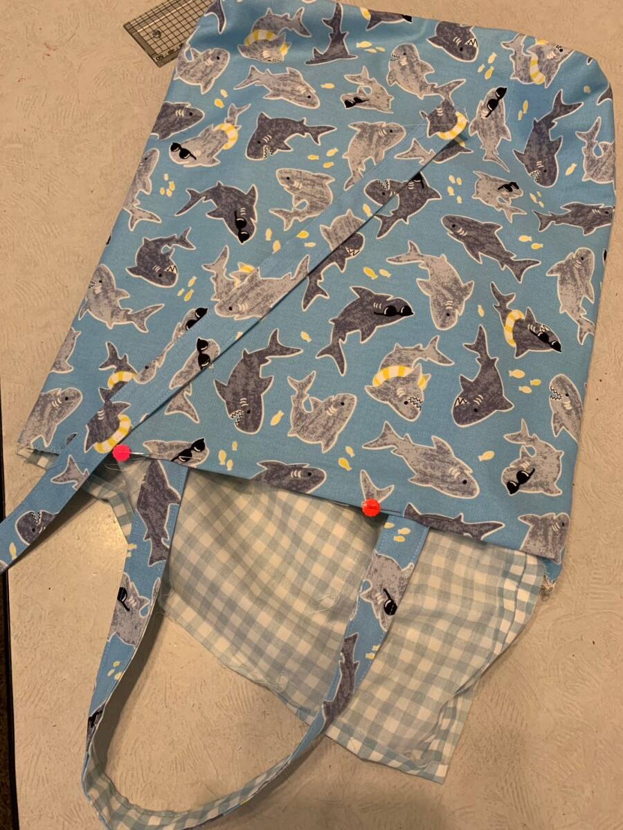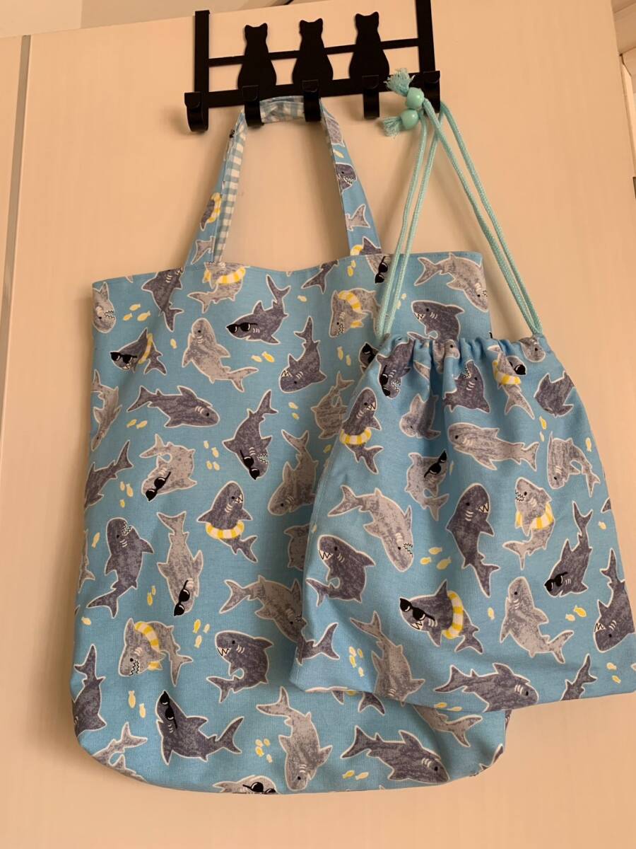 SD-01 ハンドメイド♪ 手提げ トートバッグ 巾着付き お魚さん サメ 鮫 魚 さかな ギンガム チェック 素敵 かわいい 夏 男の子 おまけ付き
