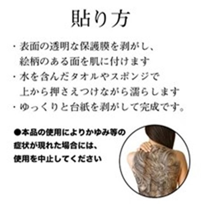 • 【貼り方手順】 余白がある場合は切り落とします。表面の透明な保護膜を剥がします。 絵柄のある面が肌に当たるように置きます。水を含んだタオルやスポンジで上から押さえつけながら滴るくらい十分に濡らします。ゆっくりと台紙を剥がします。絵柄が肌に残るよう、丁寧に剥がして完成です。気泡ができた場合は空気を押し出すように指で潰してください。