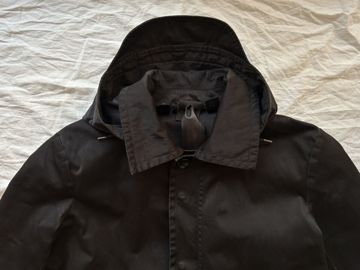フードを取り外すことでステンカラーコートとしての着用も可能です。