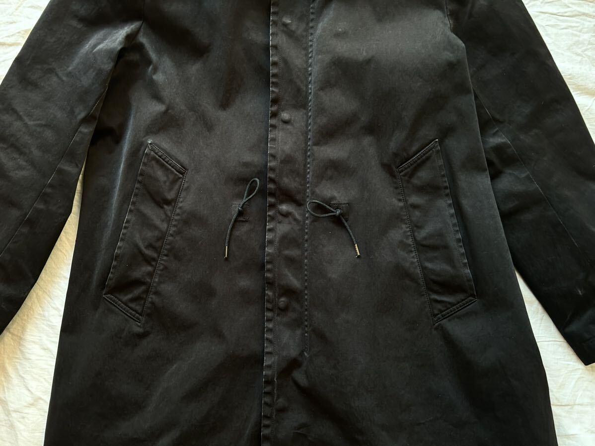 フードは取り外し可能。フロントはジッパーとスナップ式のストームプラケット。腰部分左右にハンドポケット。ウエストにドローコード。袖口にアジャスターベルト。センターベント。