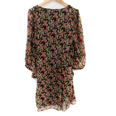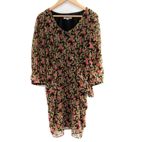 ナチュラルビューティーベーシック ワンピース ひざ丈 七分袖 Vネック 花柄 シースルー M マルチカラー 黒 ブラック ピンク レディース