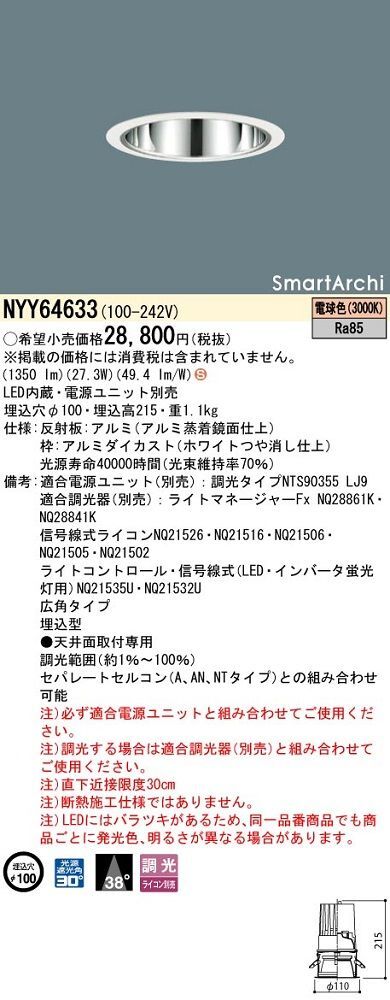 LEDダウンライト 3000K φ100 LED250形 ライコン・電源ユニット別売 NYY64633