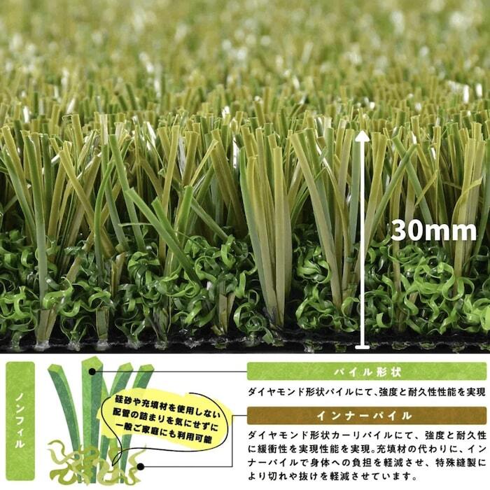 充填材や硅砂を使用しないノンフィルタイプ、膝や腰への負担軽減、踏み心地やクッション性を人工芝で再現