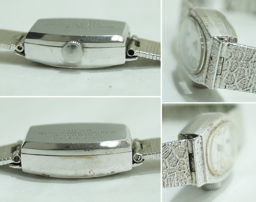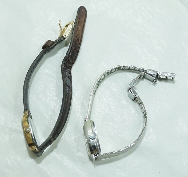 素材:金属製。写真2枚目:文字盤横1.8cm×縦1.7cm×風防含む厚み0.6cm、尾錠含む全長20cm、穴サイズ13cm~16.2cm、ベルト劣化しています、動いていません。写真5枚目:文字盤横1.1cm×縦1.9cm×風防含む厚み0.8cm、腕回り15.8cm、竜頭を回すと動きますが、時間の誤差は確認していません。