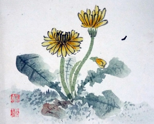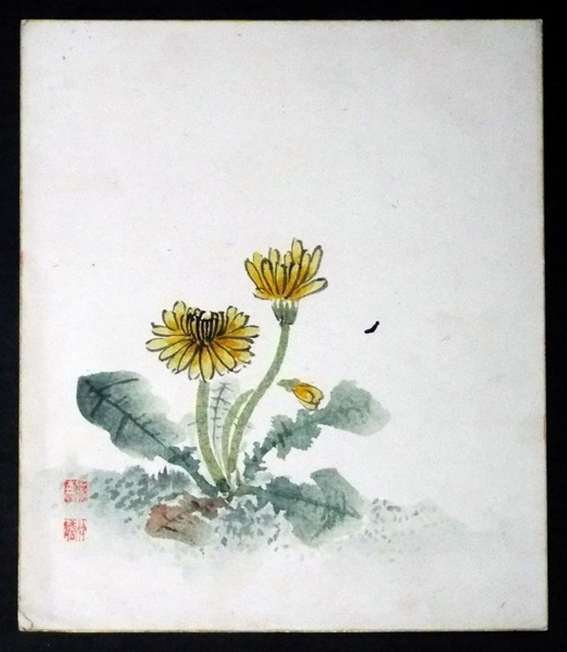 6535☆☆不明小色紙・肉筆・花画・タンポポ・印章・不明・大正昭和☆