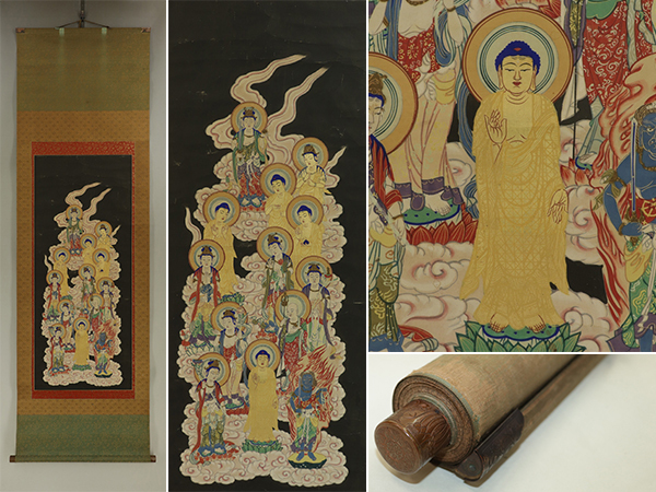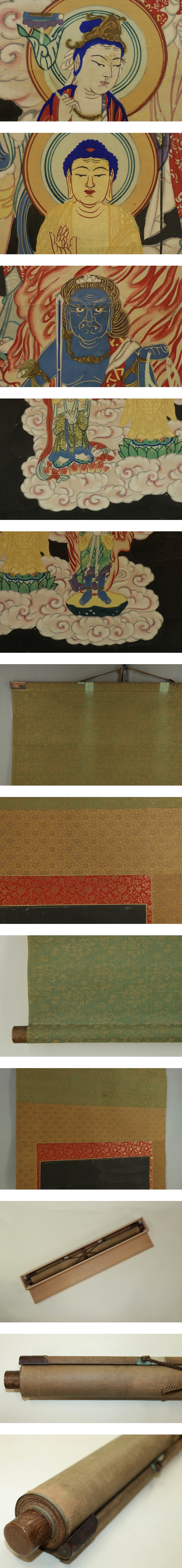 古仏画【十三佛】 本紙は、染み、汚れ、強い折れ、皺があります。 表装は、染み、汚れ、折れ、皺、虫食い、破れ、ほつれ、強いヤケ、くすみ、 金具部に変色、錆があります。 【サイズ】 作品 横約42cm×縦約101.5cm 表装 横約57cm×縦約186cm |