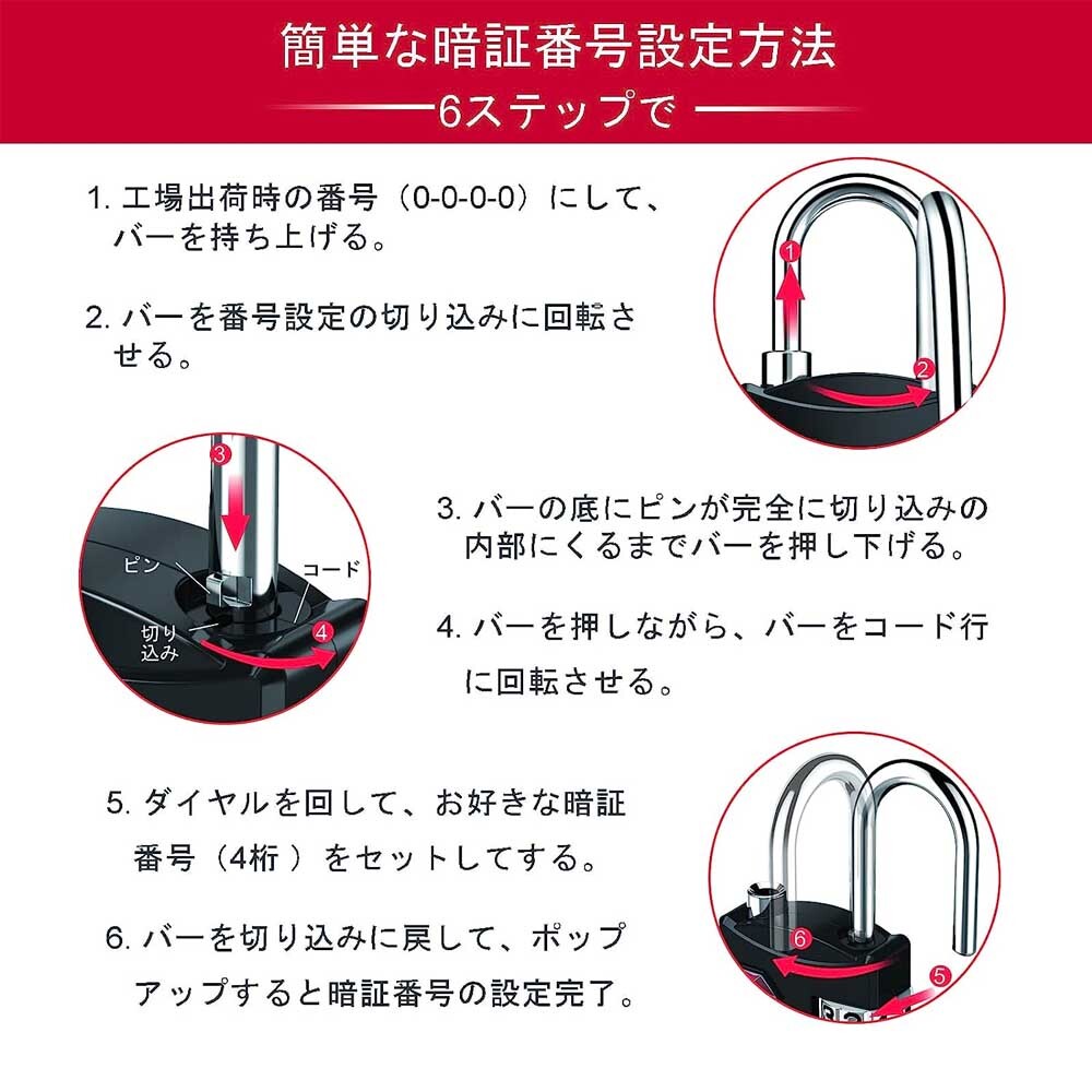 ロック設定解除方法 | 【取り扱い説明書:】 (1) 暗証番号の初期値は0000。そのままシャックルを引き上げ、90度の位置まで回す。 (2) その状態でシャックルを押し込む。押し込めないなら反対側の90度です。 (3) シャックルを押し込んだ状態で、更に90度回す。最初の位置から見て180度回転したことになります。 (4) この状態で任意の暗証番号に変更。 (5) シャックルを最初の位置に戻し、押し込んだあとでダイヤルを回し、鍵がかかることを確認。 |