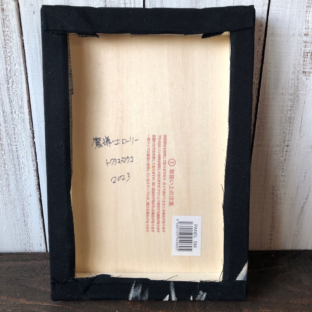 黒い布にアクリル絵の具で描いてい 木製パネルにはっています。