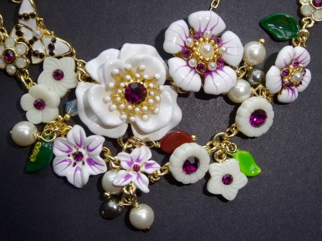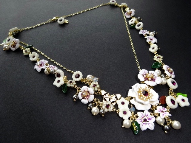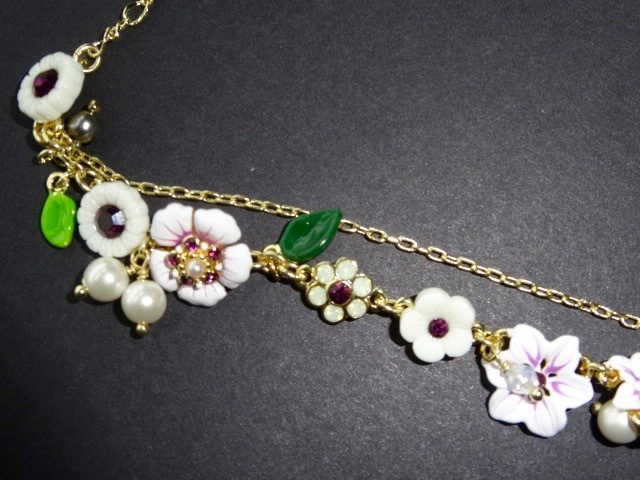 2重のネックレスで、チェーンにたくさんの小花や葉っぱやビーズ、パールや蝶々がふんだんに散りばめられています。