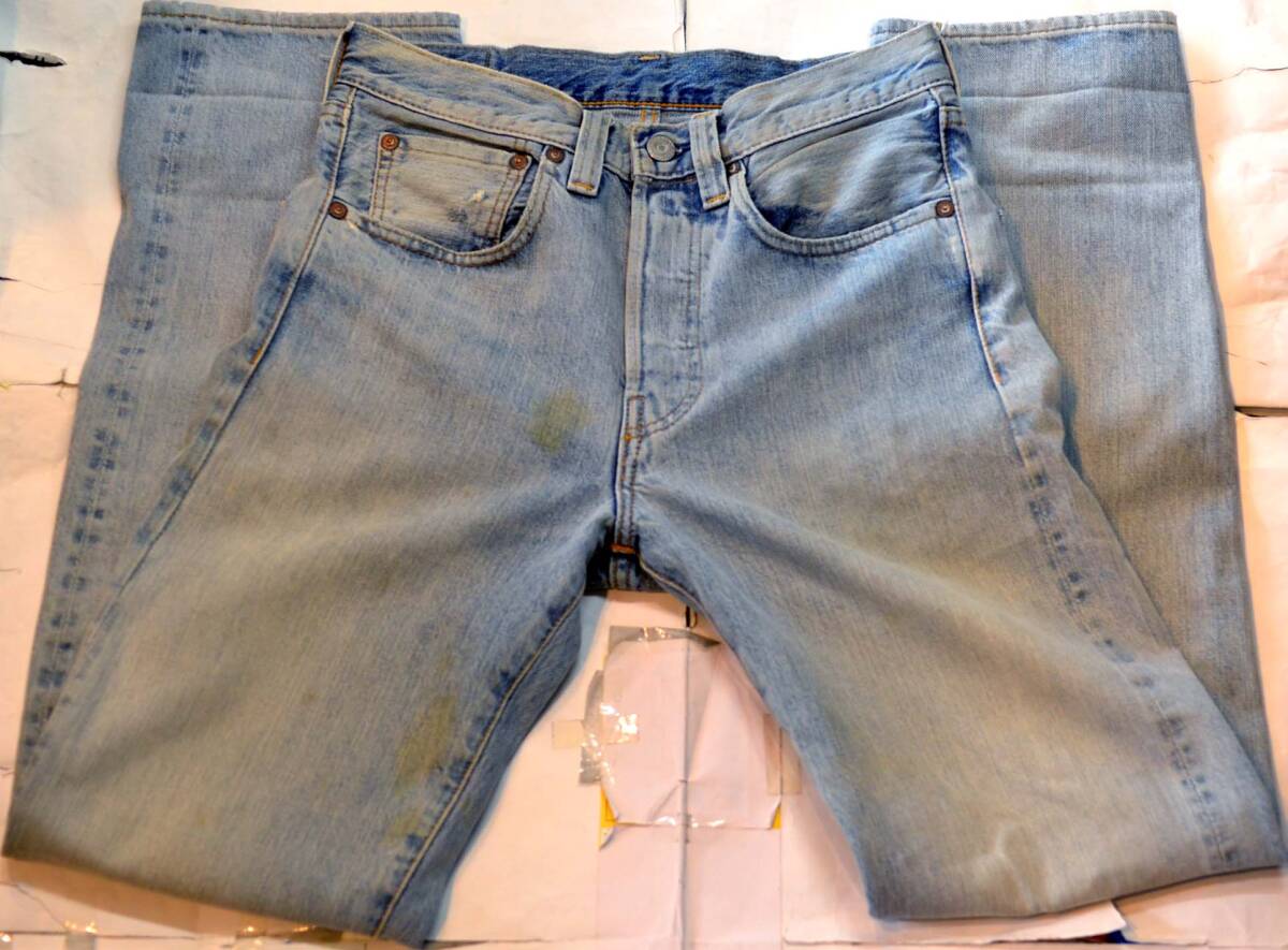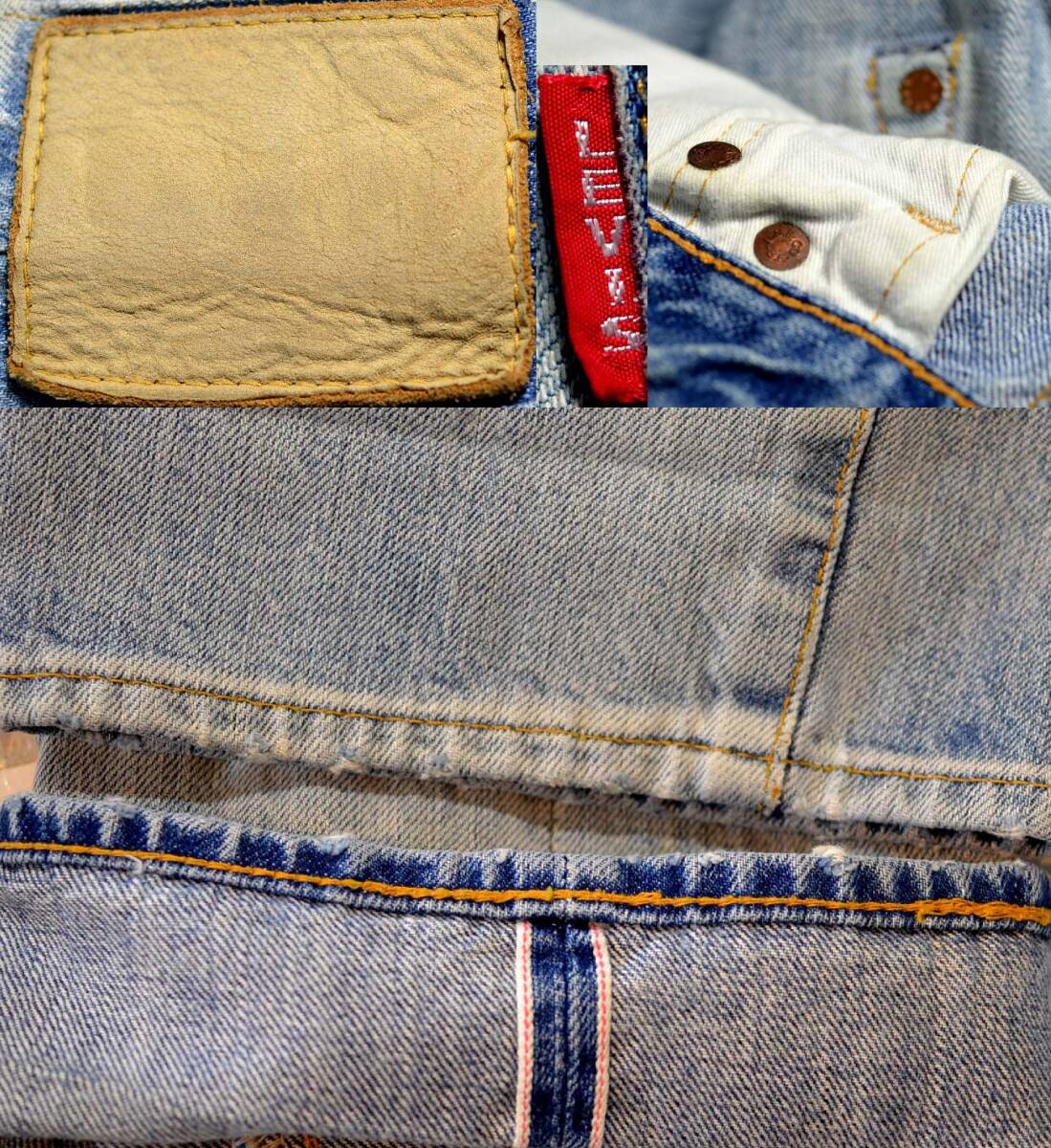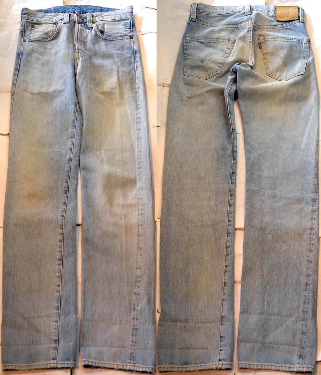 47501XXです。『ディテール紹介』隠しリベット、極太ベルトループ、銅支柱ボタン、ウエストVステッチ、 片面ビッグE赤タブ、赤耳、コインポケット耳、革パッチ、バナナイエローステッチ、裾チェーンステッチなど、かなり凝った作りです。『状態』USED加工品です。試着程度で、ほとんど使用しておりません。『色落ち、特徴など』 色落ちは抜群にかっこよく、かなり穿き込んだライトインディゴが表現されており、全体に縦落ちがビッシリ。加工は全て手作業で行われており、かなり手間がかかっております。トップレベルのかっこよさだと思います。