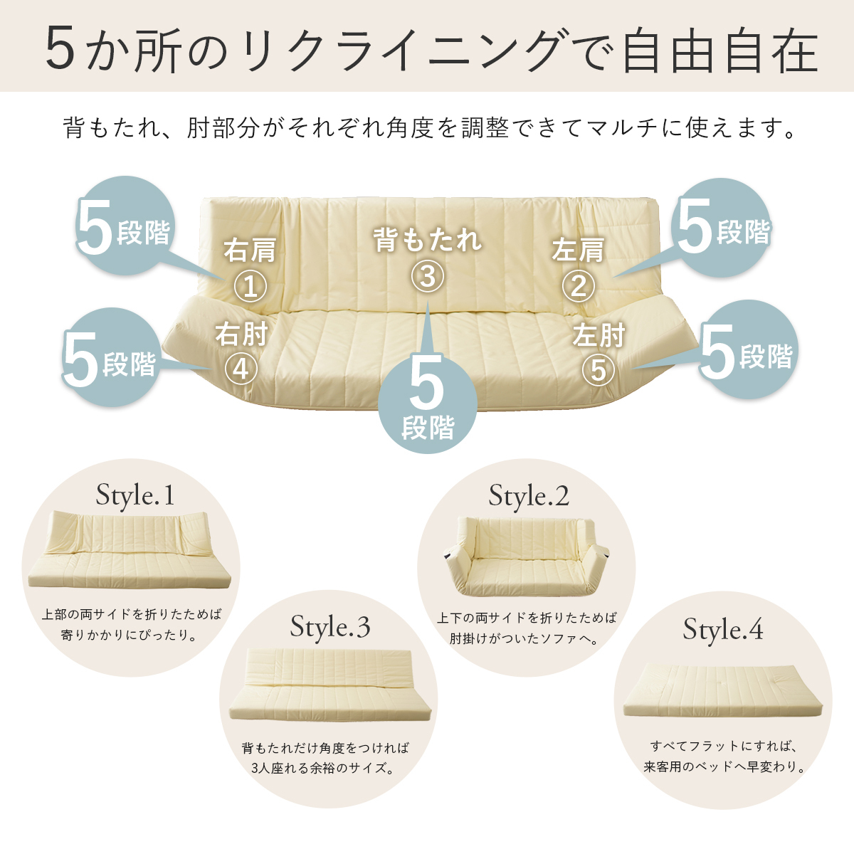 5ヵ所のリクライニングで自由自在!