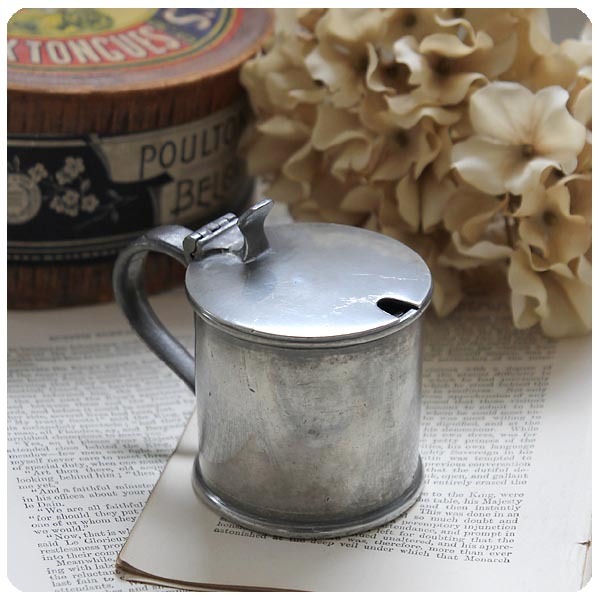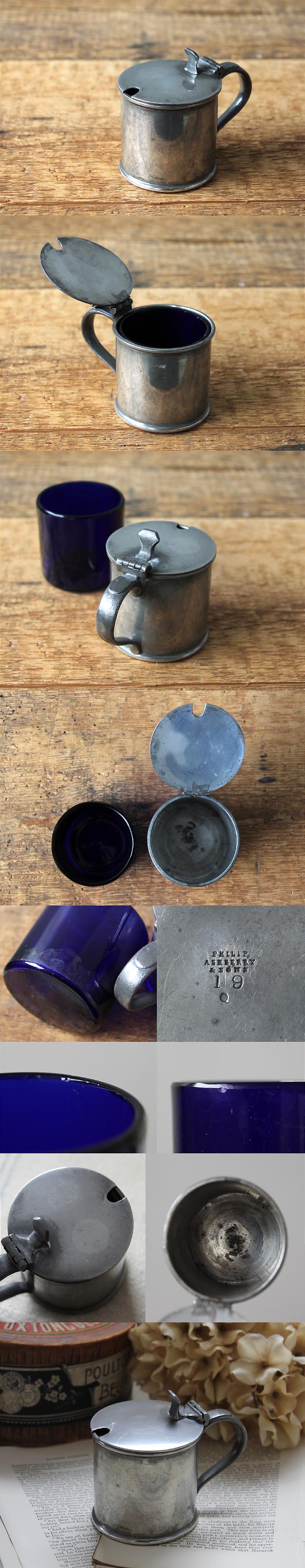 イギリス アンティーク 蓋付きピューターカップ ガラス ソルト&シュガー入れ「Philip Ashberry & Sons」P-429