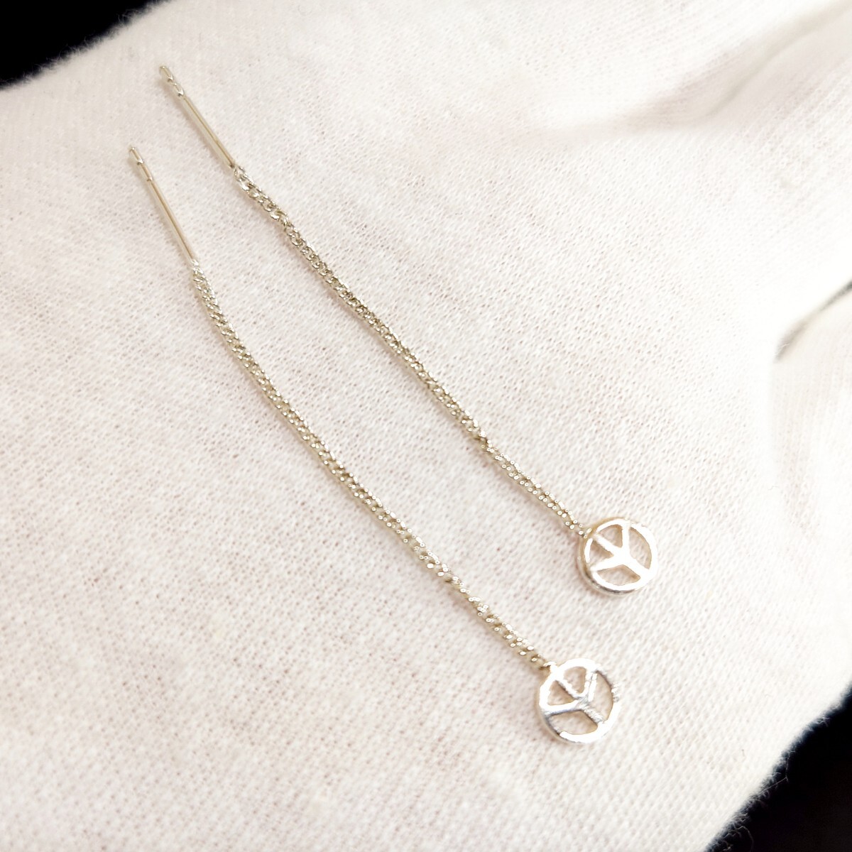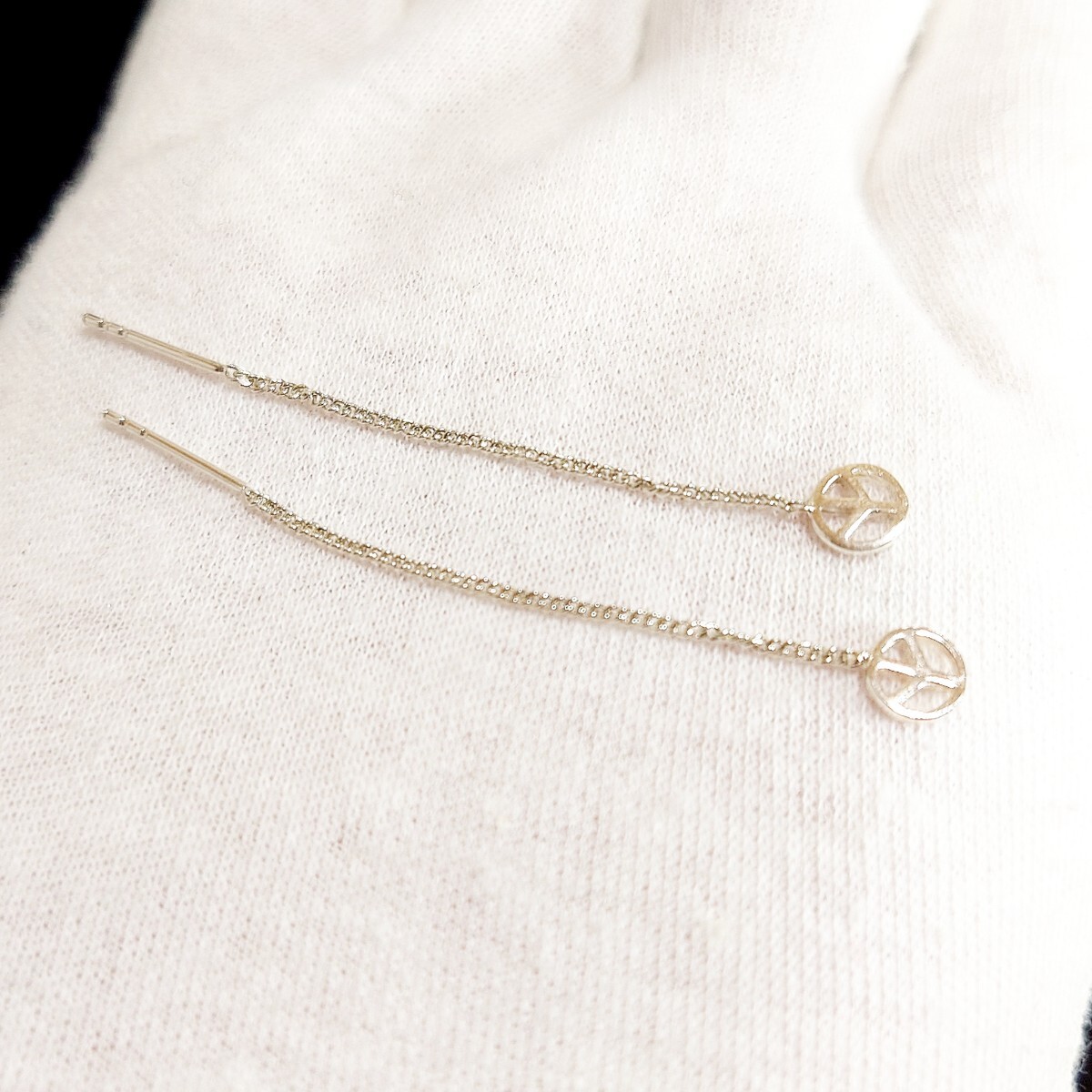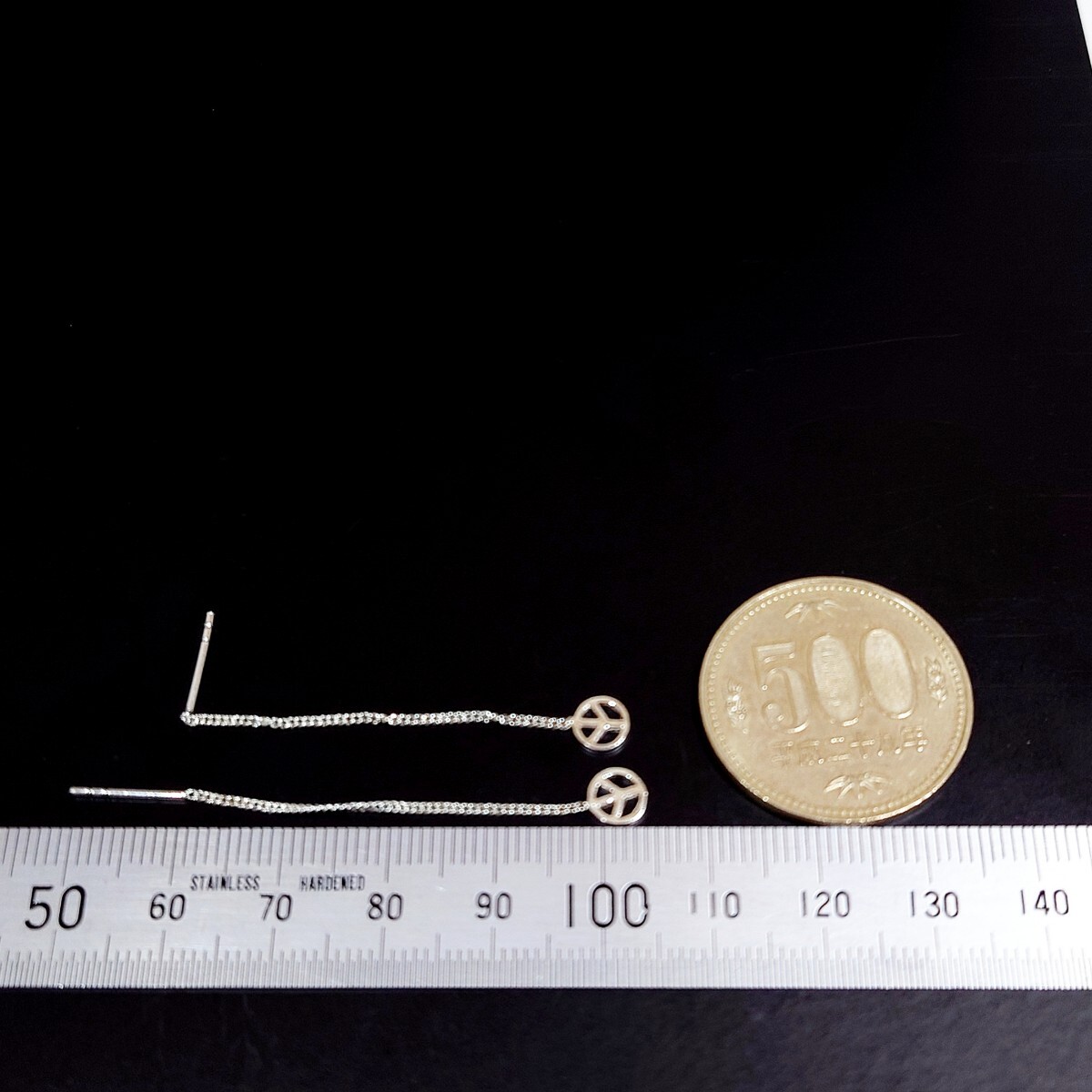 小さなピースマークがアクセントになったロングチェーンのアメリカンピアスです☆