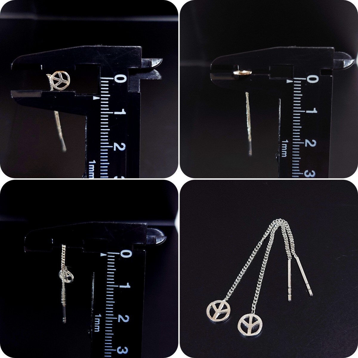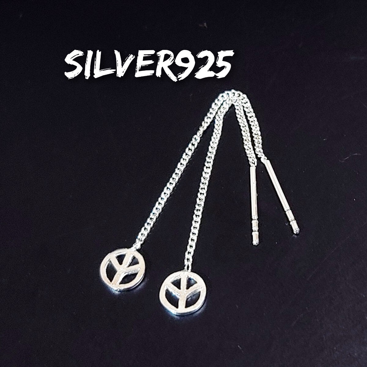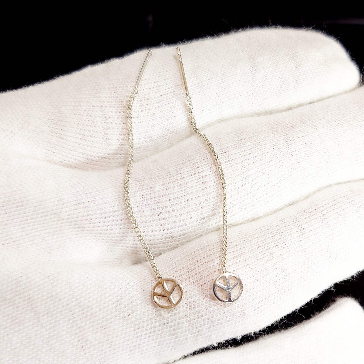 小さなピースマークがアクセントになったロングチェーンのアメリカンピアスです☆